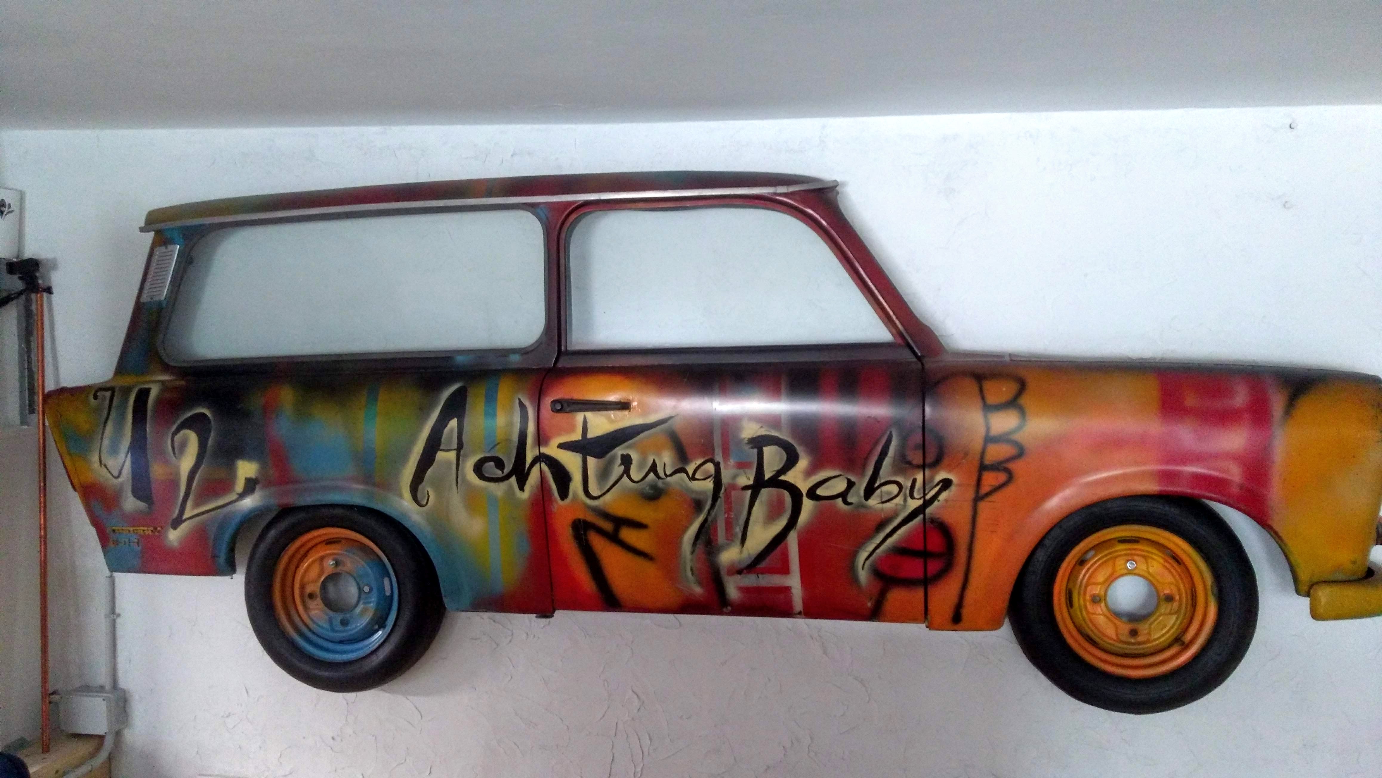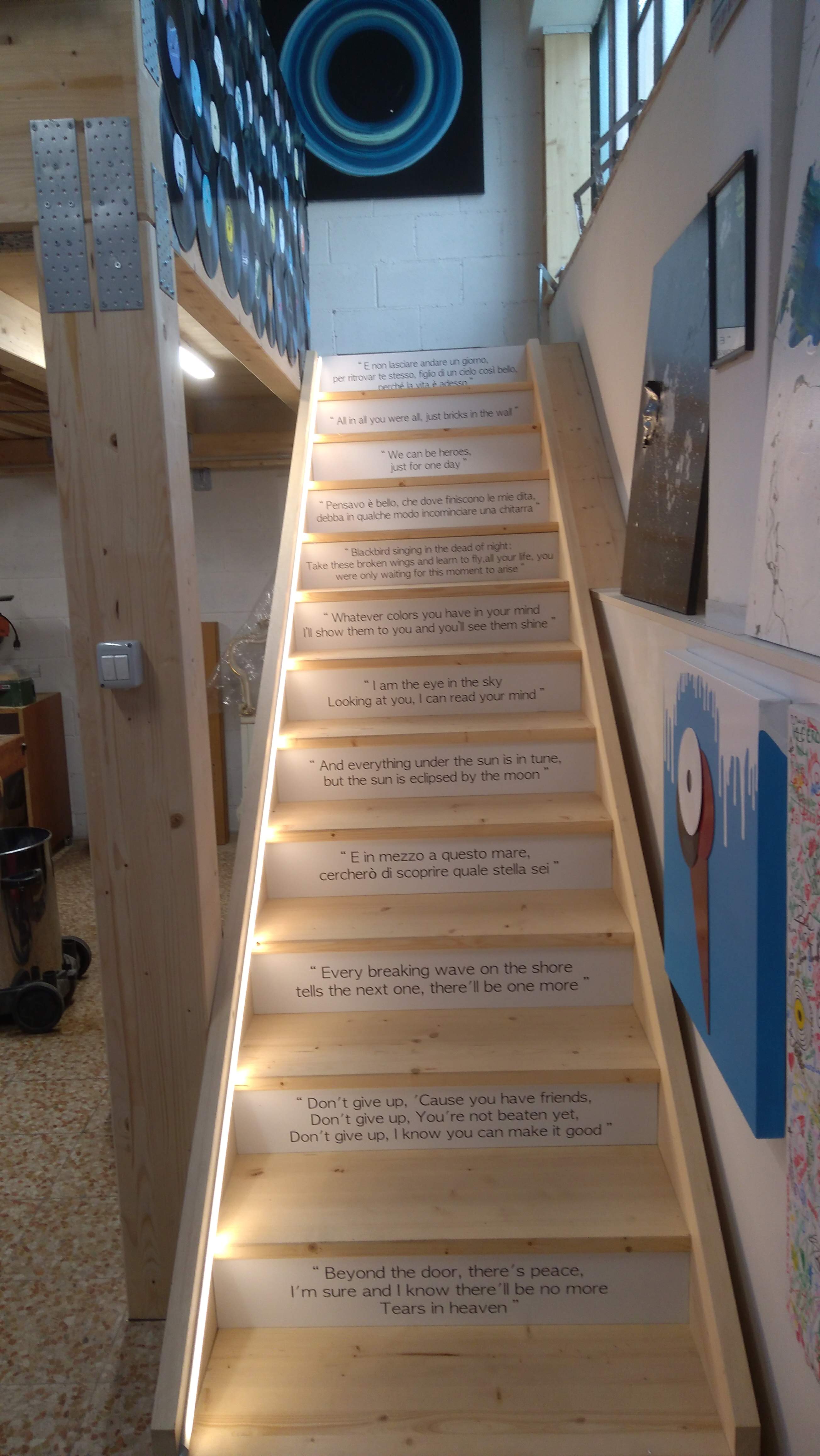 Una scalinata porta al soppalco, ma non si tratta di una scala qualunque: su ciascun gradino, infatti, è riportato il verso di una canzone. L’artista apprezza sia la musica italiana che quella internazionale, e infatti le citazioni spaziano da De André ai Pink Floyd, che restano comunque il suo gruppo preferito. Al piano superiore sono presenti altre opere, tra cui una “poltrona musicale”, realizzata riciclando il vaso di espansione di una caldaia, e appesa al muro fa bella mostra di sé una Trabant proveniente dallo Zooropa Tour degli U2, che Mattia ha avuto la fortuna di riuscire ad acquistare. Si tratta di un’automobile iconica, uno dei simboli della DDR, che dopo la caduta del muro di Berlino divenne, da scadente utilitaria, un ricercato oggetto da collezione.