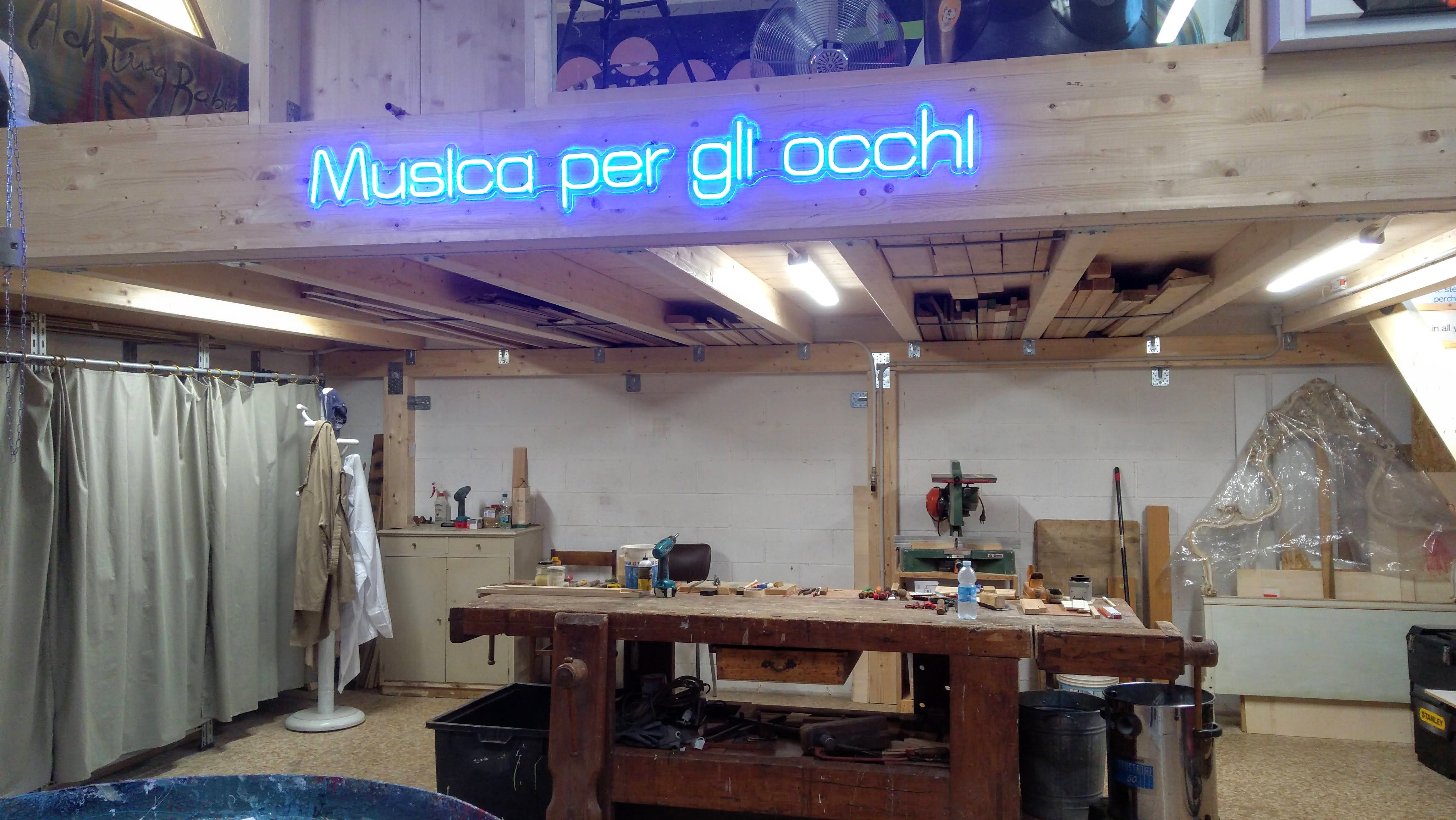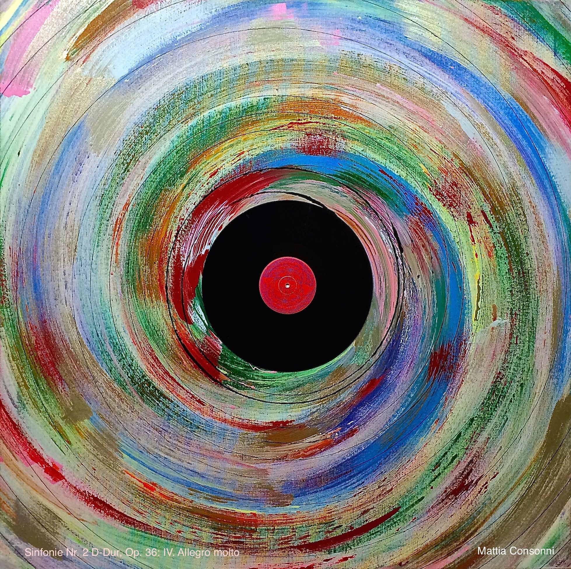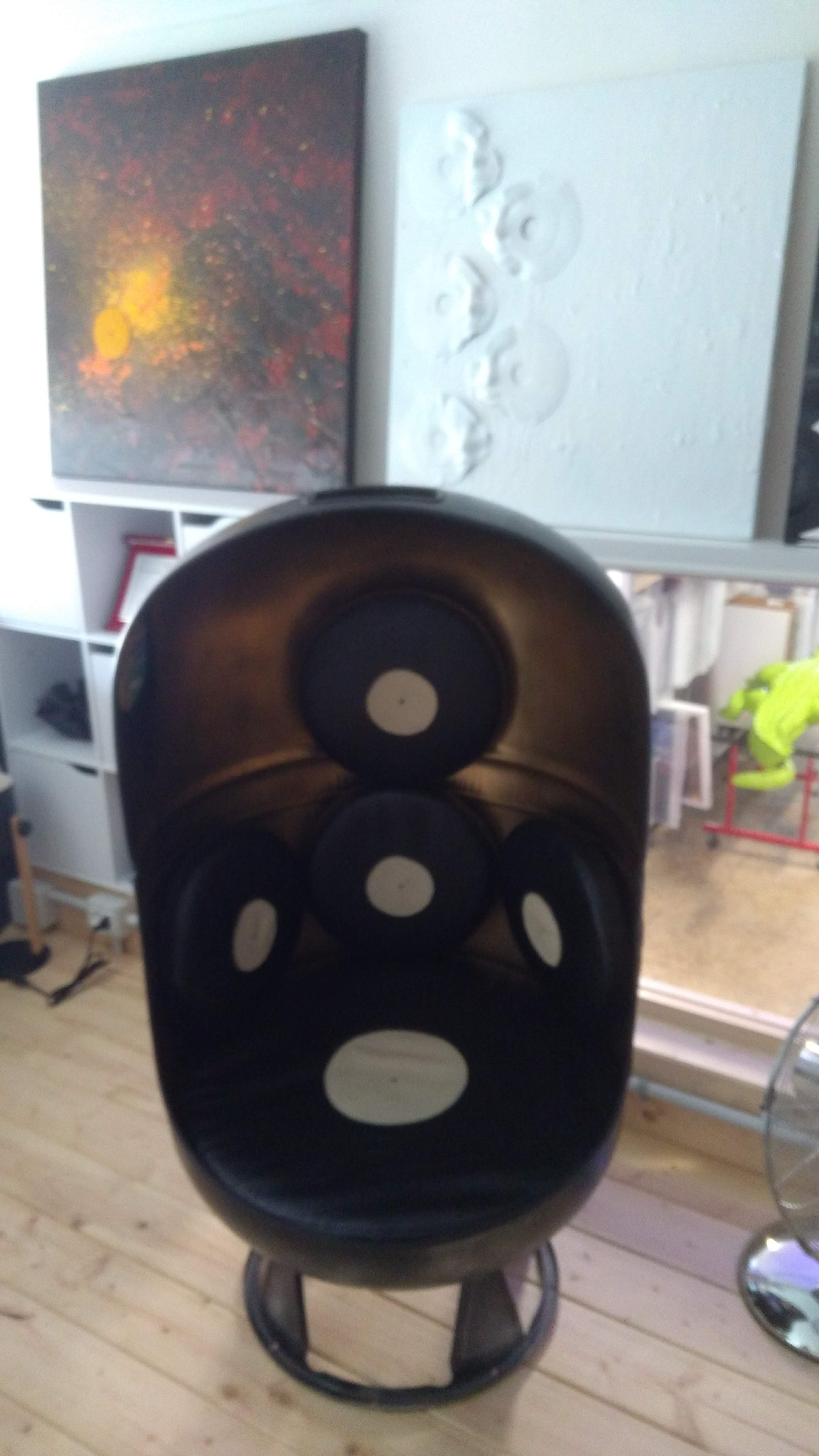 Sulla destra il mio sguardo è stato attirato da oltre 700 tele imballate, posizionate su scaffali e pronte per essere esposte o vendute. Ogni quadro porta il titolo di una canzone. Mattia, infatti, quando decide di realizzare un’opera, posa una tela bianca su un tavolo girevole e rievoca nella sua memoria le emozioni in lui suscitate dall’ascolto di un brano musicale. Egli possiede oltre 5000 vinili, quindi ha una ideale “banca dati” di oltre 50000 brani a cui ispirarsi. Sulla tela trovano posto i vinili, interi o tagliati a formare vari soggetti e composizioni, ed il colore, che viene applicato con varie tecniche: con il pennello, con il “dripping” simile a quello di Pollock (ma con una modalità differente, ideata da Consonni stesso) o utilizzando gli stessi dischi come spatola. Nessun’opera è uguale ad un’altra, ma ciò che le accomuna è l’uso di tonalità che trasmettono all’osservatore emozioni diverse, e comunque – almeno a mio avviso – sempre gioiose. “Musica per gli occhi” è infatti il motto dell’artista, che campeggia anche in una scritta al neon al centro dello studio.