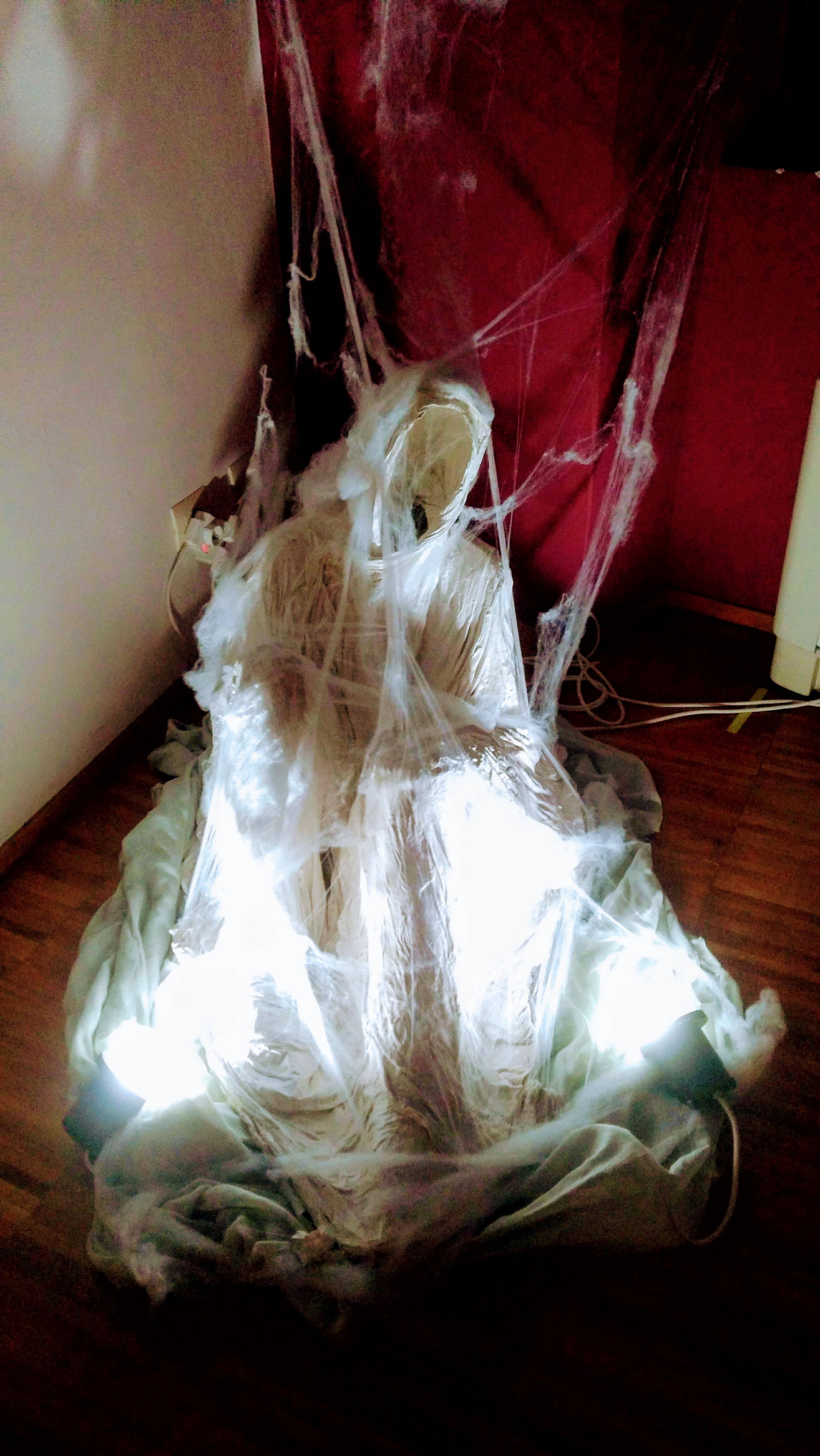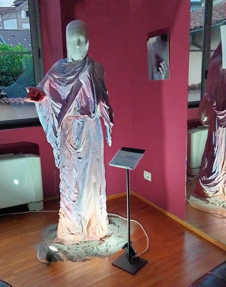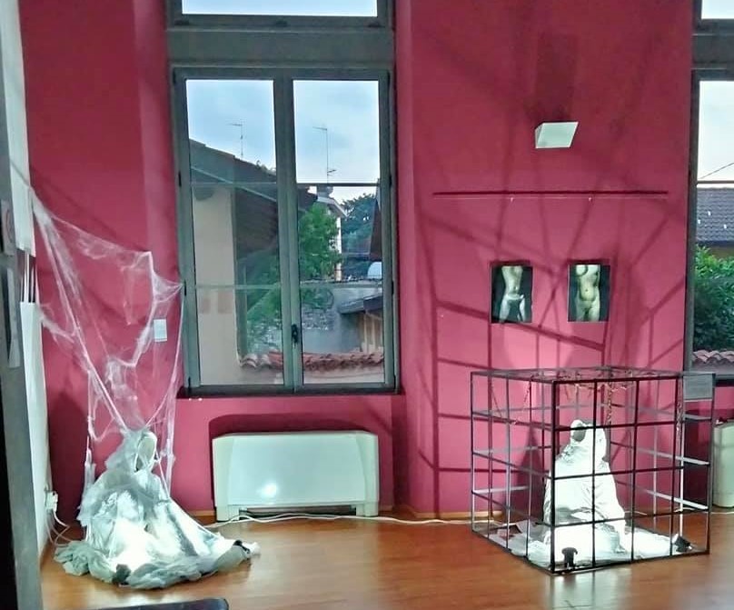 Fortemente significative sono tre statue in gesso, sagome vuote per indicare che la persona è stata svuotata, annichilita dalla relazione distruttiva. La prima, Ragnatela, mostra la donna avvolta nelle tele di ragno che rappresentano le bugie e le contraddizioni in cui il partner l’ha avviluppata. La seconda, La Gabbia dei pensieri, raffigura la condizione di prigionia rappresentata dalla relazione e l’incapacità di uscirne a causa della condizione di dipendenza da parte della donna, alimentata dal linguaggio del narcisista che destabilizza la sua vittima al punto di ridurla all’immobilità. La terza, Risorta dalle ceneri, rappresenta la donna in piedi, con un volto e con degli abiti che rivestono il suo nuovo Sé: ella è divenuta una persona libera, indipendente, fiera e desiderosa di tornare di nuovo incontro alla vita.