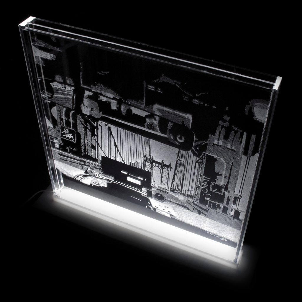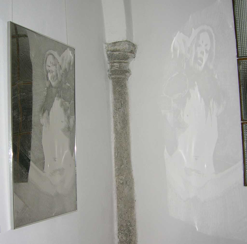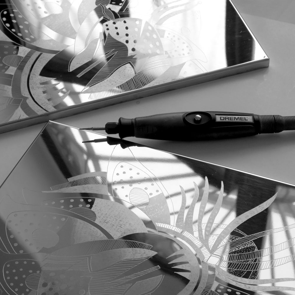 La seconda tecnica, quella sull’acciaio, prevede invece l’utilizzo di un trapano (rotation drill) simile a quello utilizzato dai dentisti, di marca Dremel. Con punte diamantate l’artista incide, quasi sfiorando, la superficie del metallo, creando una sorta di chiaroscuro che definisce l’immagine. Essendo degli “specchi di metallo”, queste lastre riflettono sui muri opposti il soggetto, quasi a sembrare un disegno a carboncino sul muro.