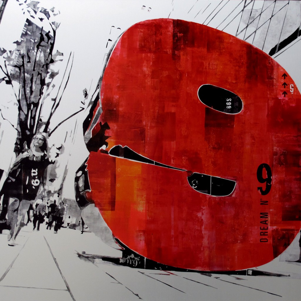 L’artista, inoltre, utilizza delle lettere trasferibili Letraset, quelle in voga negli anni ’70 e uscite di produzione negli anni ’90, per apporre dei messaggi, inerenti all’argomento del quadro o più nascosti.