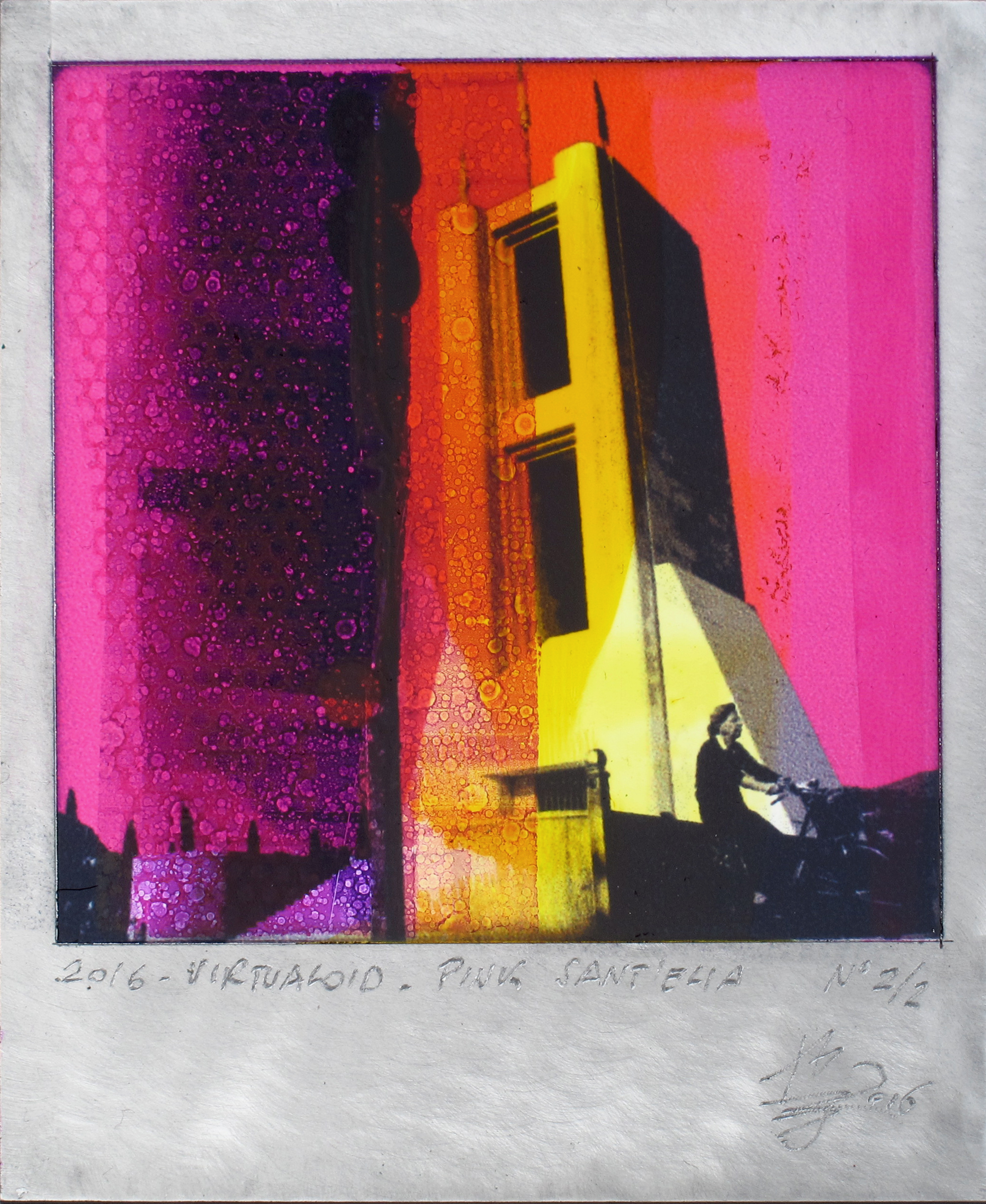 La prima tecnica, quella maggiormente utilizzata dall’artista attualmente, parte da un’immagine fotografica o astratta che viene riprodotta su un pannello di alluminio anodizzato. Viene applicato un foglio di plastica adesiva sulla lastra metallica e viene riprodotto il disegno (ciò che compare nella foto prescelta). Con un bisturi vengono poi tagliate tutte le “mascherine” che compongono il disegno. Alcune parti del foglio vengono quindi rimosse e vengono applicati, con un rullo, inchiostri da stampa e colori per vetro, in un alternarsi di opaco e brillante. Man mano che si applicano altri strati di colore, si rimuovono le maschere e si continua con l’inchiostratura sino ad ottenere, strato dopo strato, il lavoro finito.