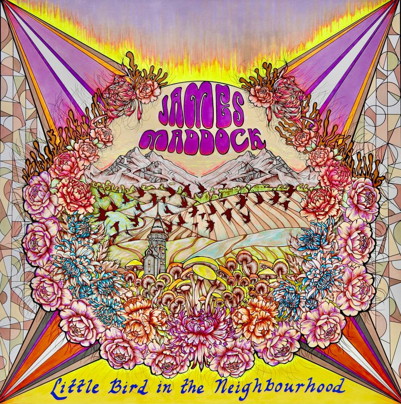 Queste parole di James Maddock, cantautore inglese trapiantato ormai da vent’anni negli USA e con un seguito di fedeli appassionati in Italia, descrivono efficacemente l’artwork di “Little Bird in the Neighbourhood”, il suo recente album, che sembra uscito dalla fantasia di un grafico degli anni ’60. Il lettering ondeggiante, la corona di fiori che circonda il paesaggio, i colori vivaci e “acidi” del booklet interno hanno un indubbio aspetto vintage. La copertina, a differenza di quelle degli ultimi due dischi, che rappresentano il cantautore di Leicester in un ritratto fotografico, raffigura uno scenario naturale dai tratti psichedelici. Realizzata dall’amica artista e musicista scozzese Jill Leighton, l’immagine sembra voler preannunciare un contenuto che, a detta dello stesso Maddock, si configura come caratterizzato da sonorità più folk. Anche lo scatto che ritrae James nelle ultime pagine del booklet, virato nei toni del marrone, rimanda ad atmosfere rurali d’altri tempi.