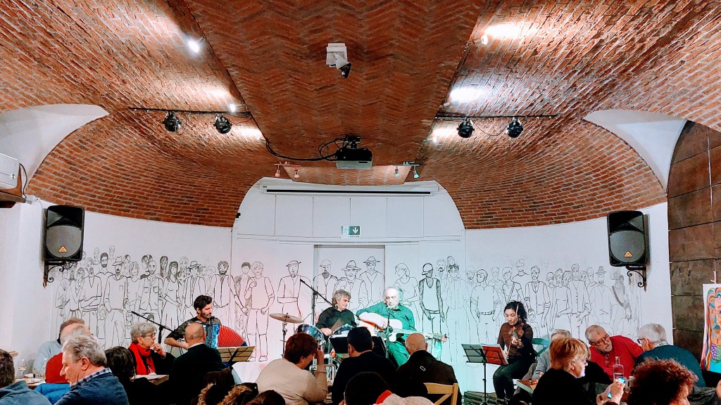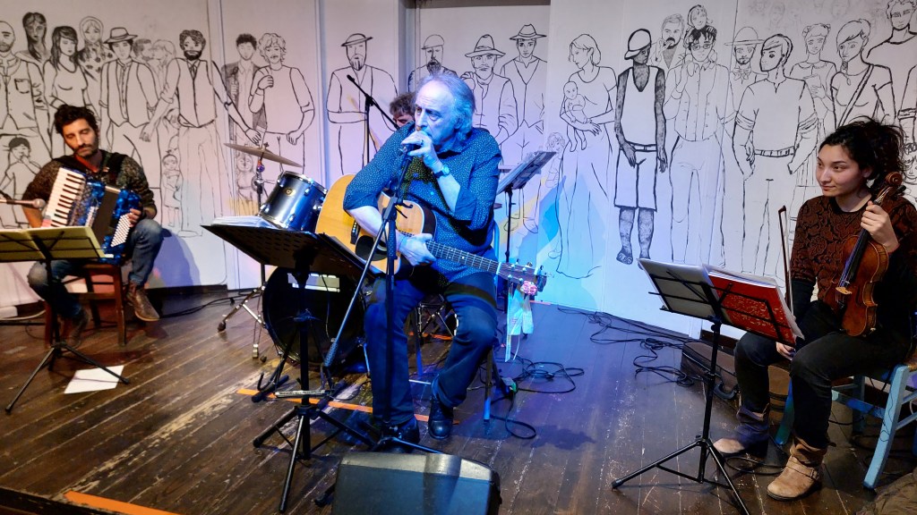 Questa dichiarazione di intenti racchiude in sé il senso dell’omaggio a Faber che Renato Franchi e l’Orchestrina del Suonatore Jones hanno reso nel loro recente concerto presso “La Tela- Osteria del Buon Essere” di Rescaldina. Il percorso della band nel riproporre il repertorio di De André insieme a quello di molti altri grandi autori, parallelamente alle proprie composizioni, è iniziato negli anni ’90 e ha visto la formazione impegnata in centinaia di serate e di progetti, molti dei quali a sfondo sociale e a tutela della memoria storica. Dal 2006 ad oggi, poi, la formazione (che in alcuni dischi ha preso il nome di “Renato Franchi & His Band”, pur avvalendosi degli stessi componenti) ha pubblicato dieci album di inediti, collaborando con ospiti prestigiosi come i Gang, Claudio Lolli, Alberto Bertoli, Fabrizio Poggi,Michele Gazich. Meritano una citazione, tra i vari lavori, Le stagioni di Anna Frank, disco ispirato dalla visita di Franchi ad Auschwitz, Con un bel nome d’avventura, dedicato alla Resistenza, e gli ultimi quattro dischi (Oggi mi meritavo il mare, 2018; InCanto, 2020; Penne e calamai, 2021, e Mi perdo e m’innamoro, di recente pubblicazione) in cui il cantautore ha esplorato prevalentemente tematiche più intimiste, descrivendo il sentimento d’amore in tutte le sue sfaccettature e ricercando serenità e bellezza nella quotidianità, nella natura, nei rapporti umani.