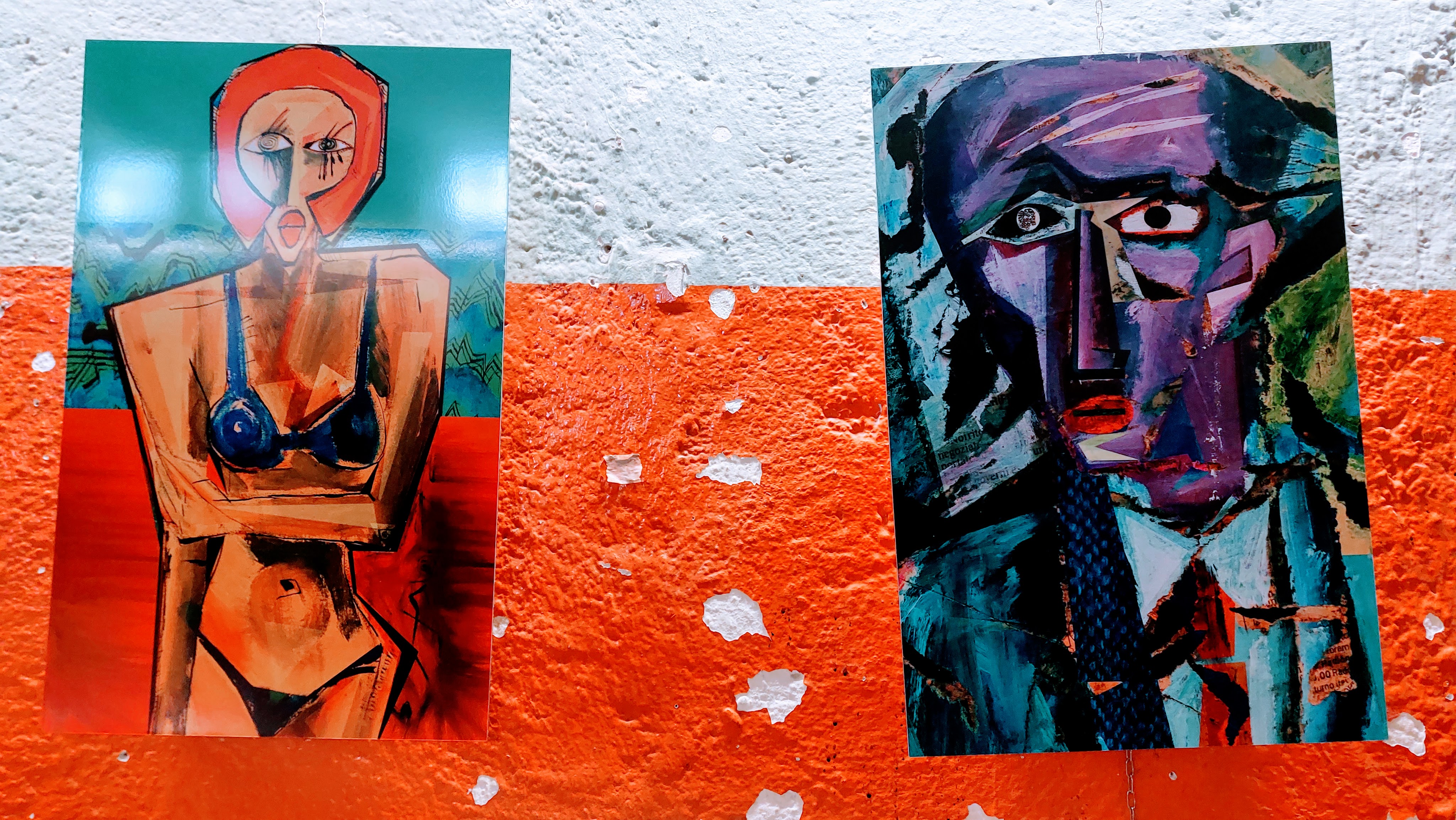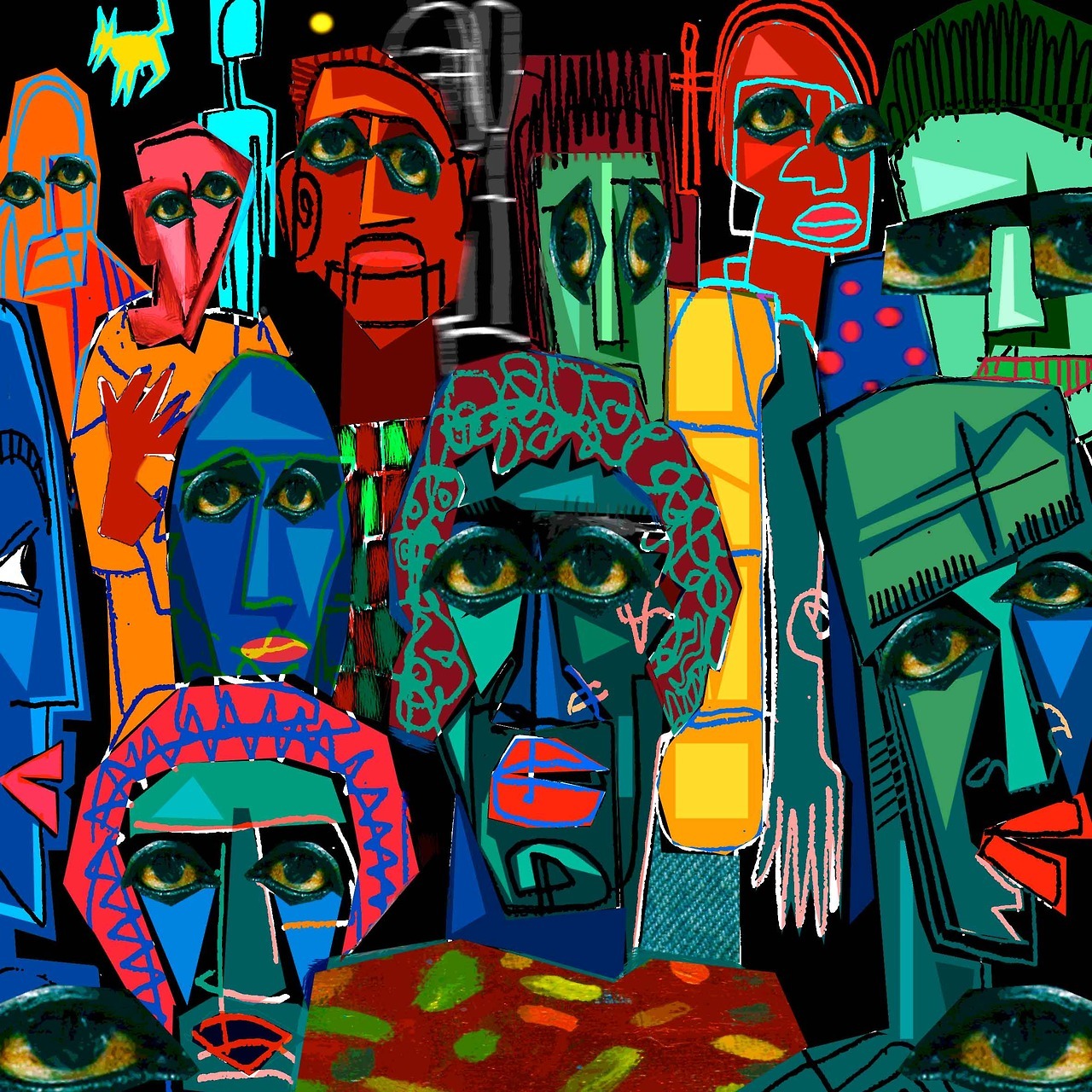 Nelle capigliature dei due protagonisti di AfroBacio, opera ispirata alle maschere africane, la texture labirintica va ad intessere le capigliature dei personaggi. La tematica della migrazione è trattata in Arrivanti, dove compaiono ancora le variopinte maschere, e in Lampedusa, abbronzatissimo, in cui l’uomo raffigurato alza le mani, inerme, lanciando un grido di dolore, sotto un cielo rosso sangue, davanti all’indifferenza di chi non lo accoglie. Attonito è lo sguardo, invece, del personaggio che indossa il Giubbotto di salvataggio. Anche la pandemia non lascia indifferente l’artista, al punto che il protagonista di Maskera satura indossa una FFP2 che gli copre la maggior parte del volto, sia pure in trasparenza, mentre la Donna a metà porta una mascherina chirurgica al collo come fosse un monile.