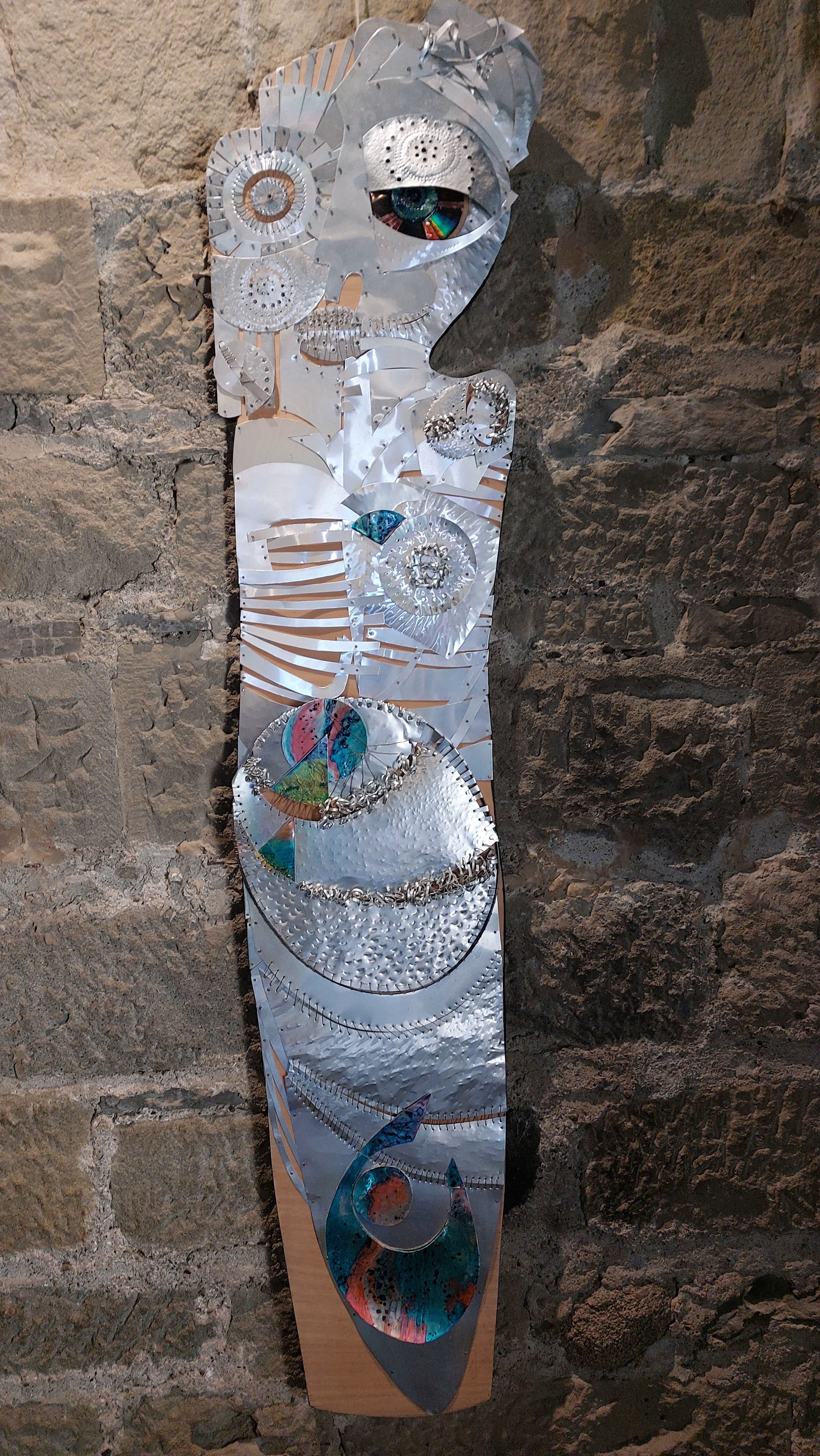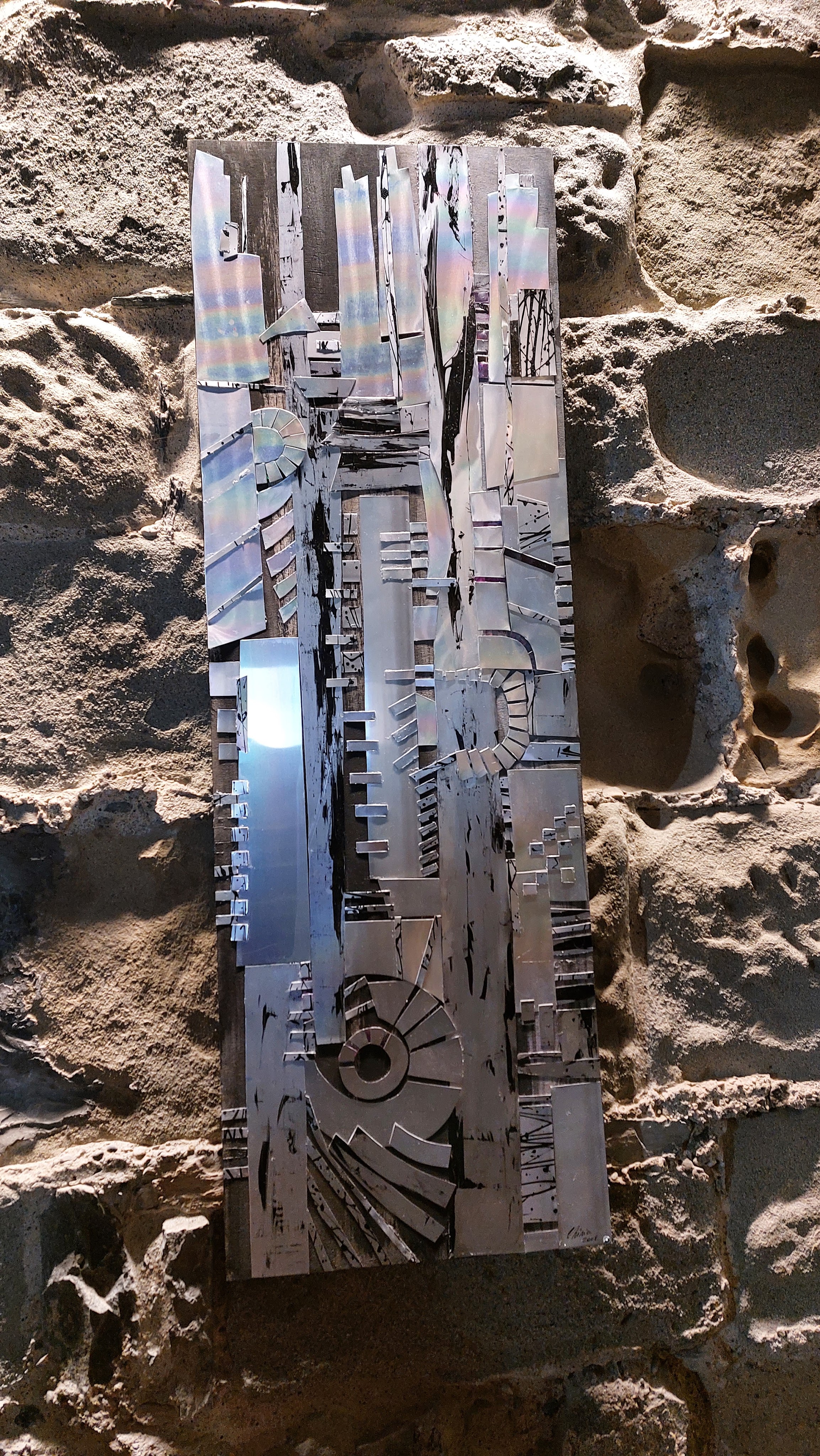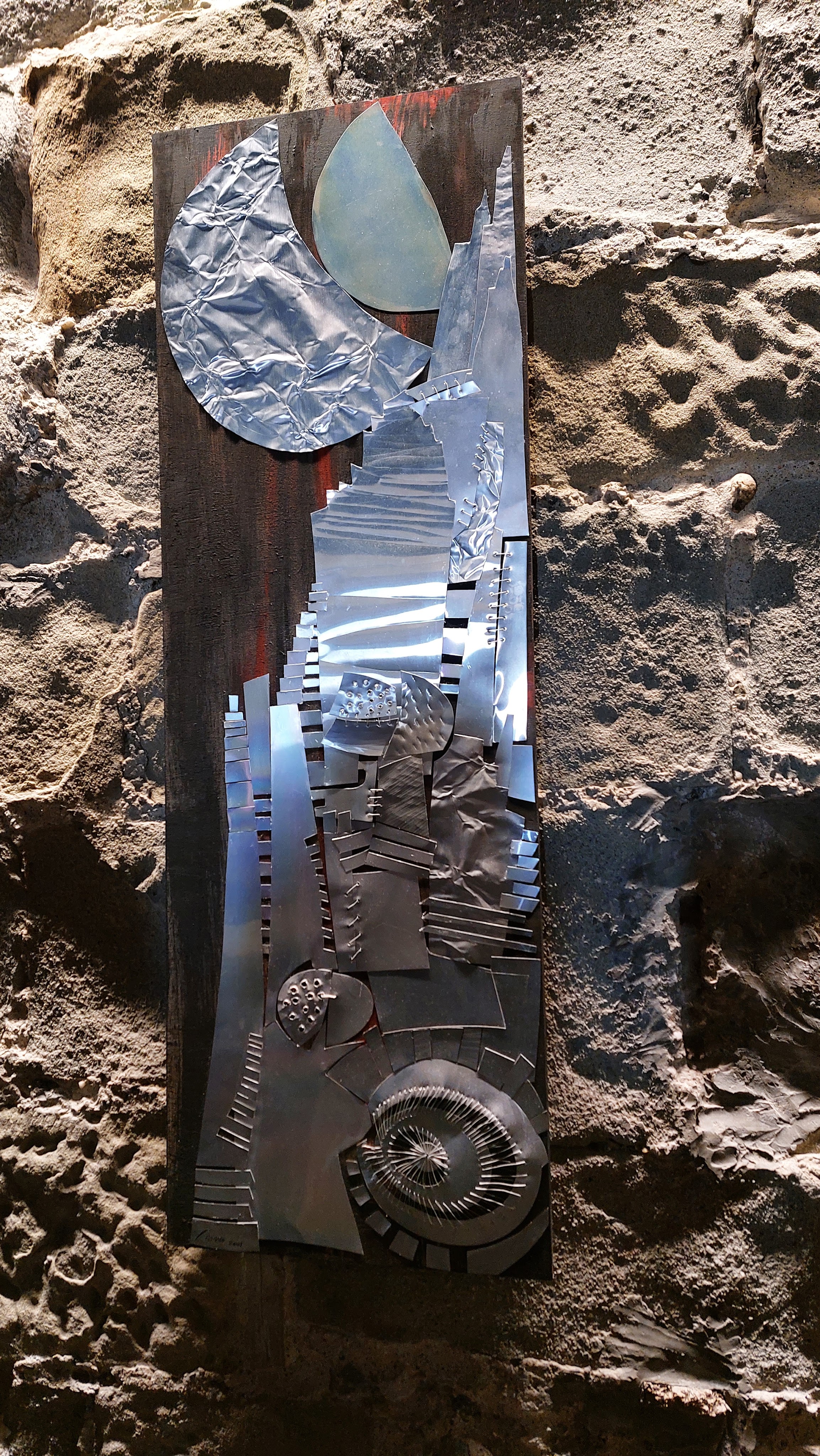 Nella sala all’ingresso, la prima opera esposta, Armatura, è realizzata su una tavola di legno marino sulla quale sono applicati strati di alluminio martellato, sagomato, tagliato e cucito a mano. La presenza del metallo evoca la figura del guerriero, del tipico cavaliere medioevale. Aurora è invece composta da pezzi di alluminio e frammenti di compact disc, mentre la parte in basso è un “classico” olio su tela. Altre due opere, Città metallica I e II, richiamano un tipico borgo medievale, basato sulla verticalità, illuminato da una luna di alluminio martellato. C’è poi una ceramica, Torneo medievale, risalente al 1996-97, realizzata con tre tecniche differenti assemblate insieme.