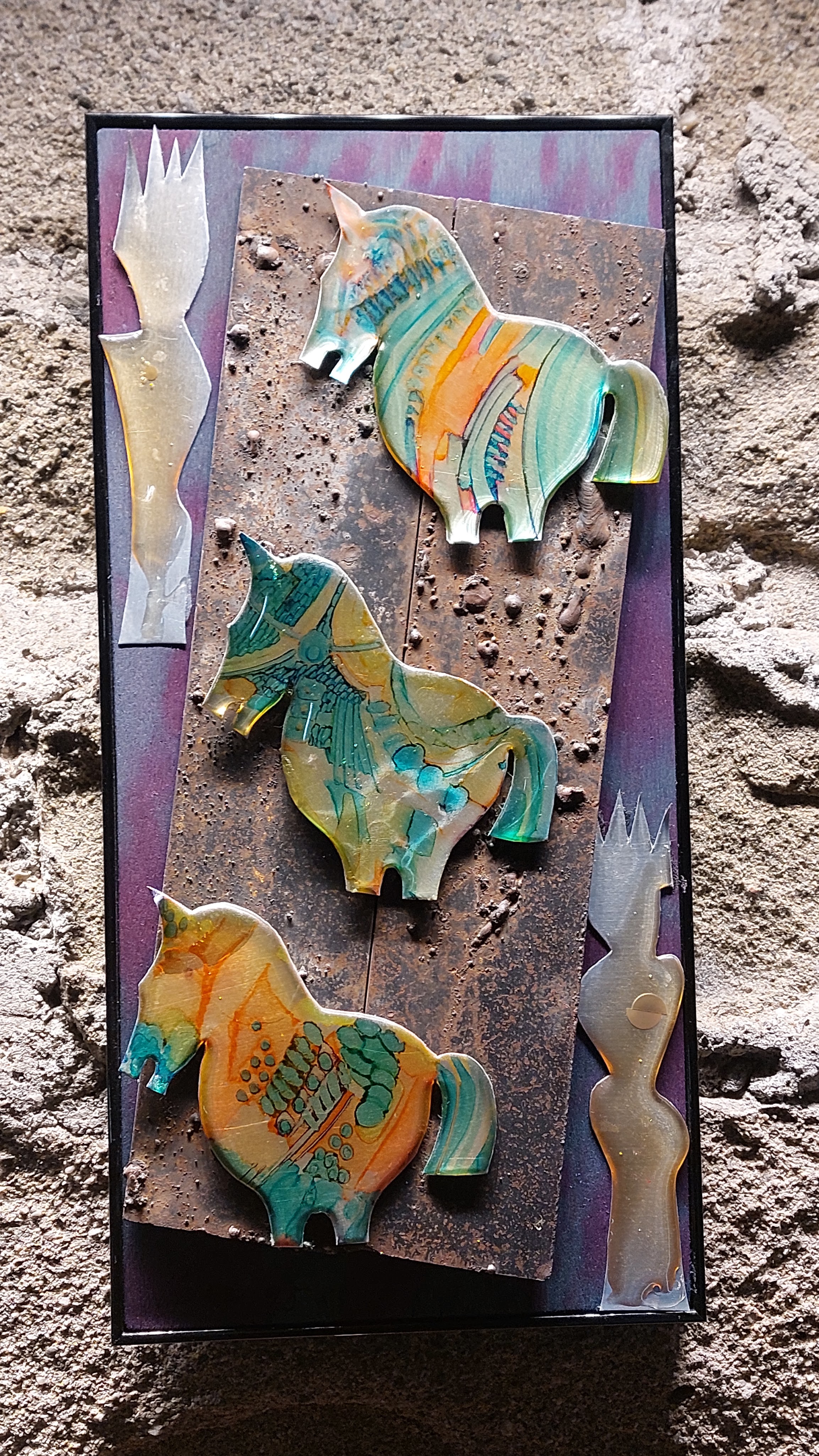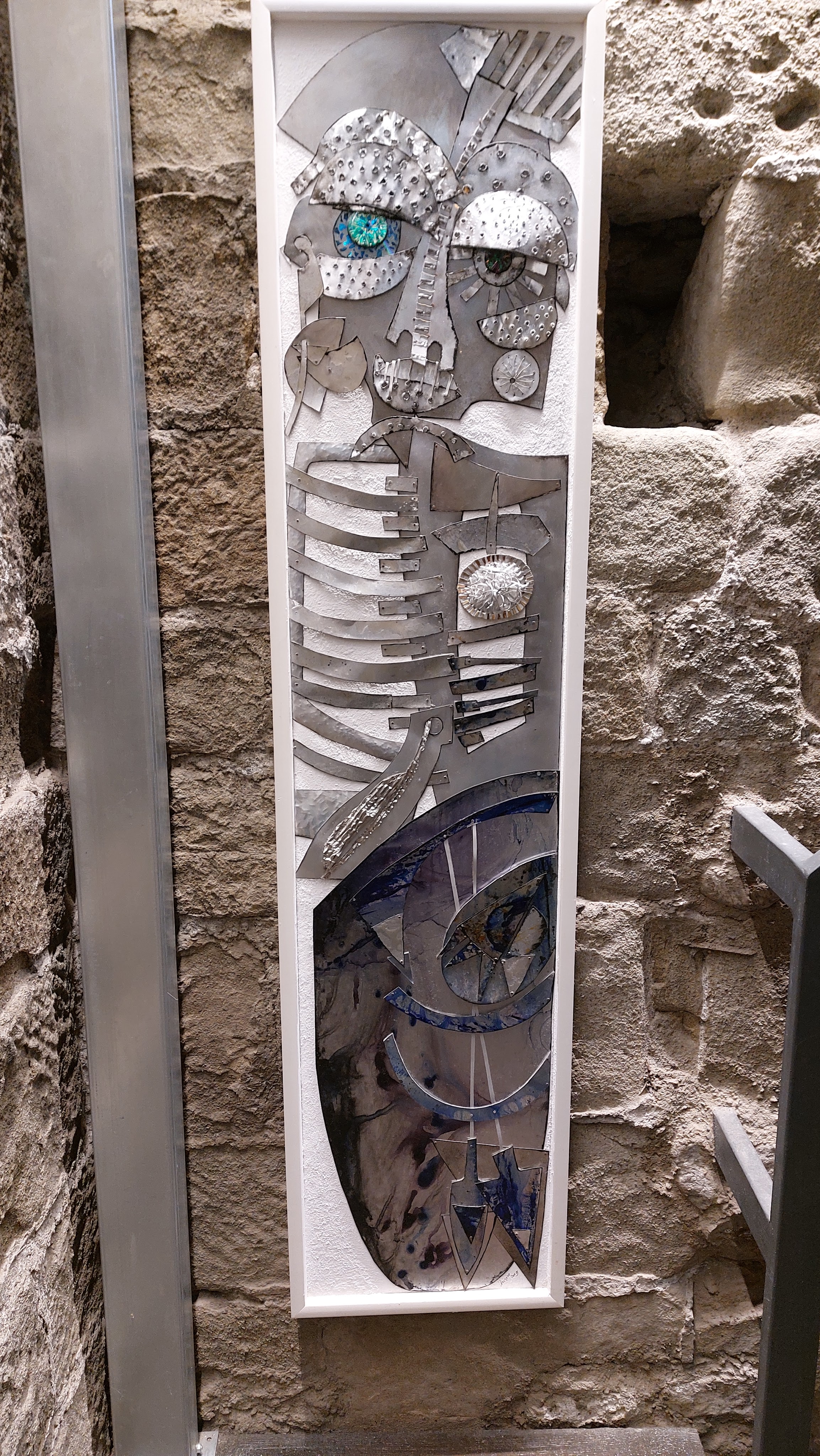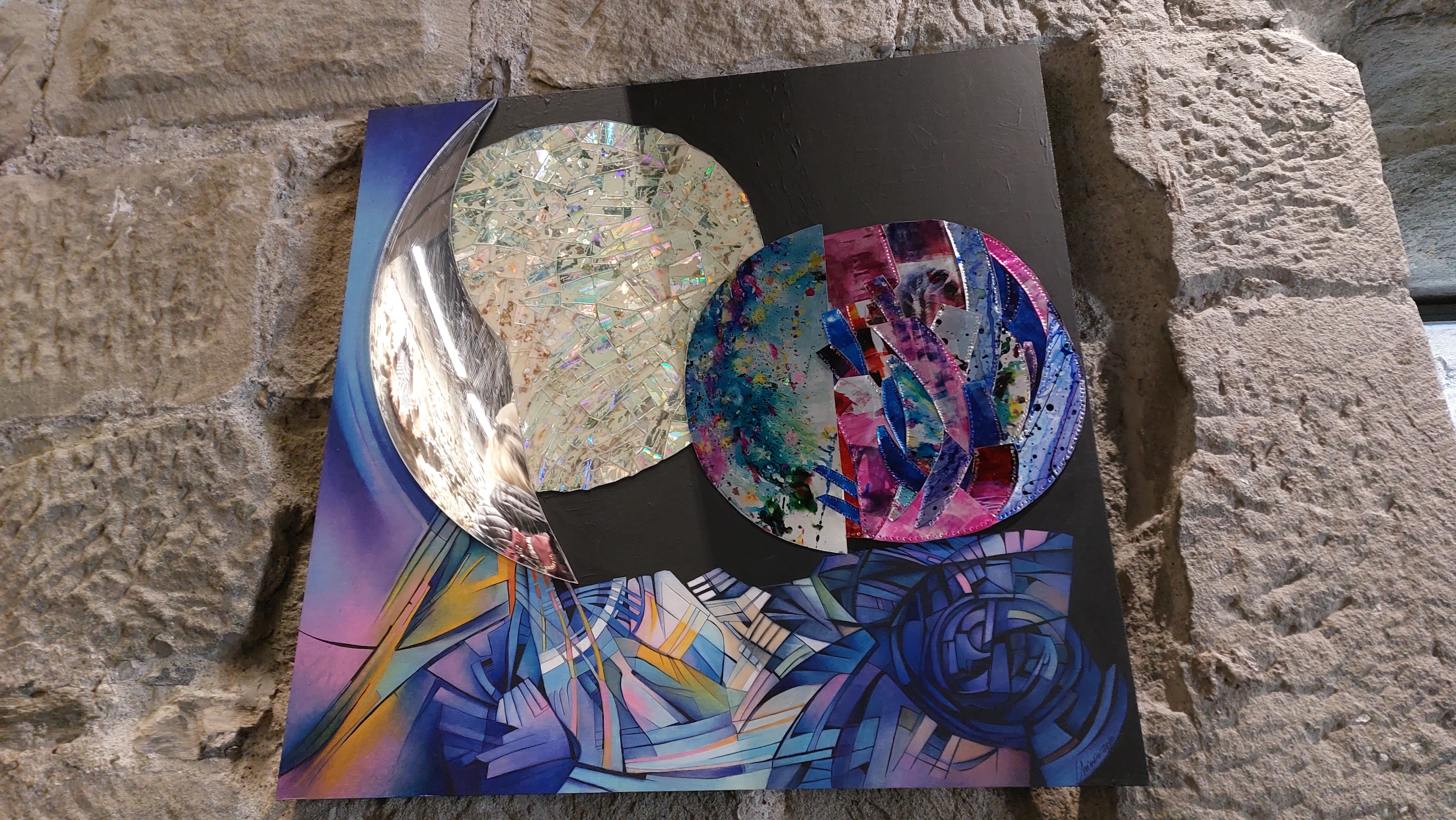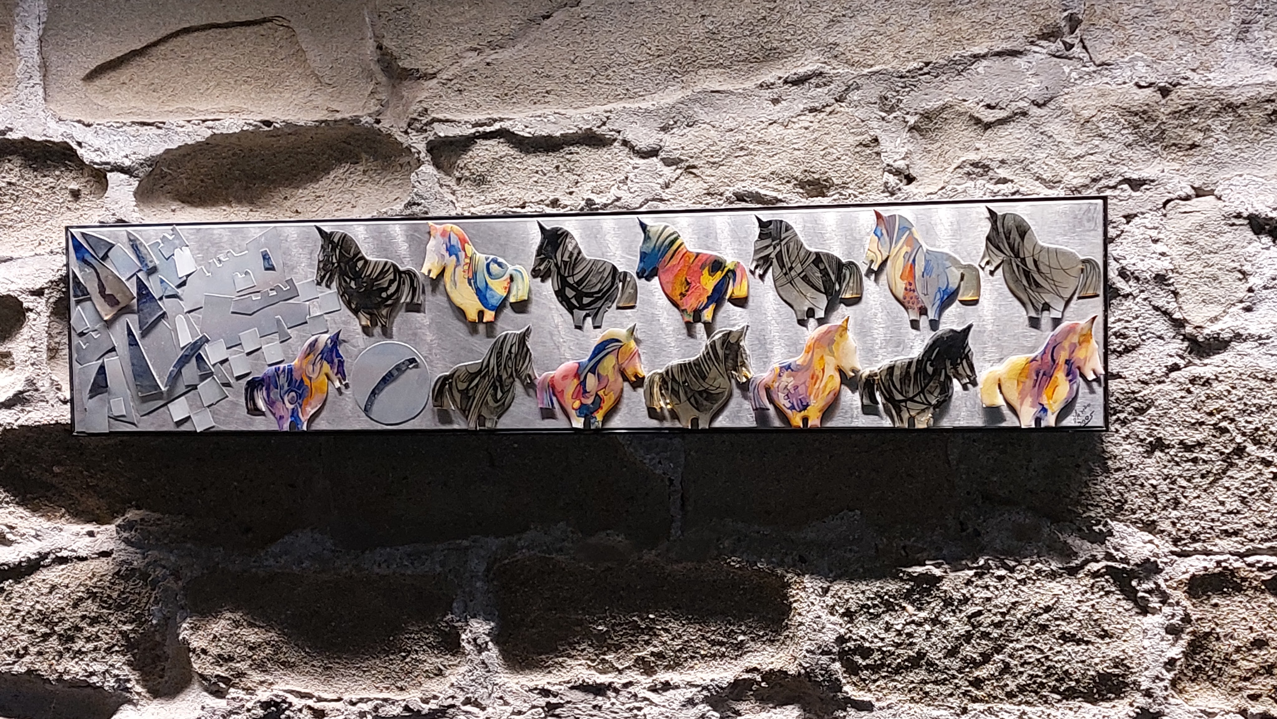 Nella sala all’ingresso, la prima opera esposta, Armatura, è realizzata su una tavola di legno marino sulla quale sono applicati strati di alluminio martellato, sagomato, tagliato e cucito a mano. La presenza del metallo evoca la figura del guerriero, del tipico cavaliere medioevale. Aurora è invece composta da pezzi di alluminio e frammenti di compact disc, mentre la parte in basso è un “classico” olio su tela. Altre due opere, Città metallica I e II, richiamano un tipico borgo medievale, basato sulla verticalità, illuminato da una luna di alluminio martellato. C’è poi una ceramica, Torneo medievale, risalente al 1996-97, realizzata con tre tecniche differenti assemblate insieme.