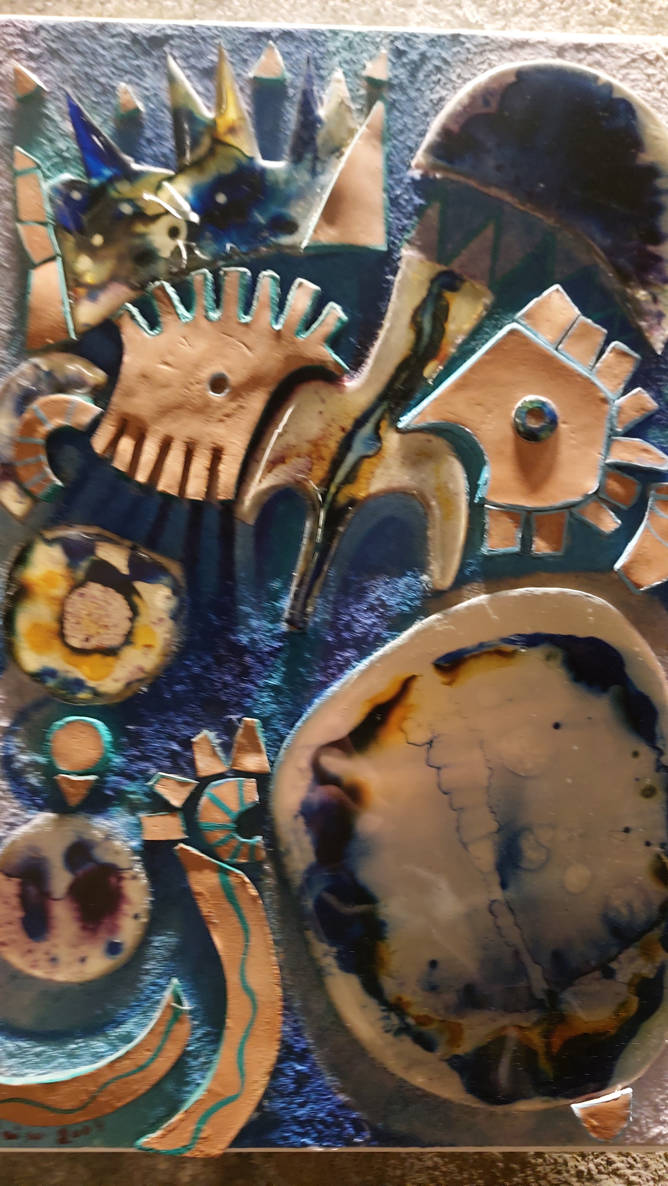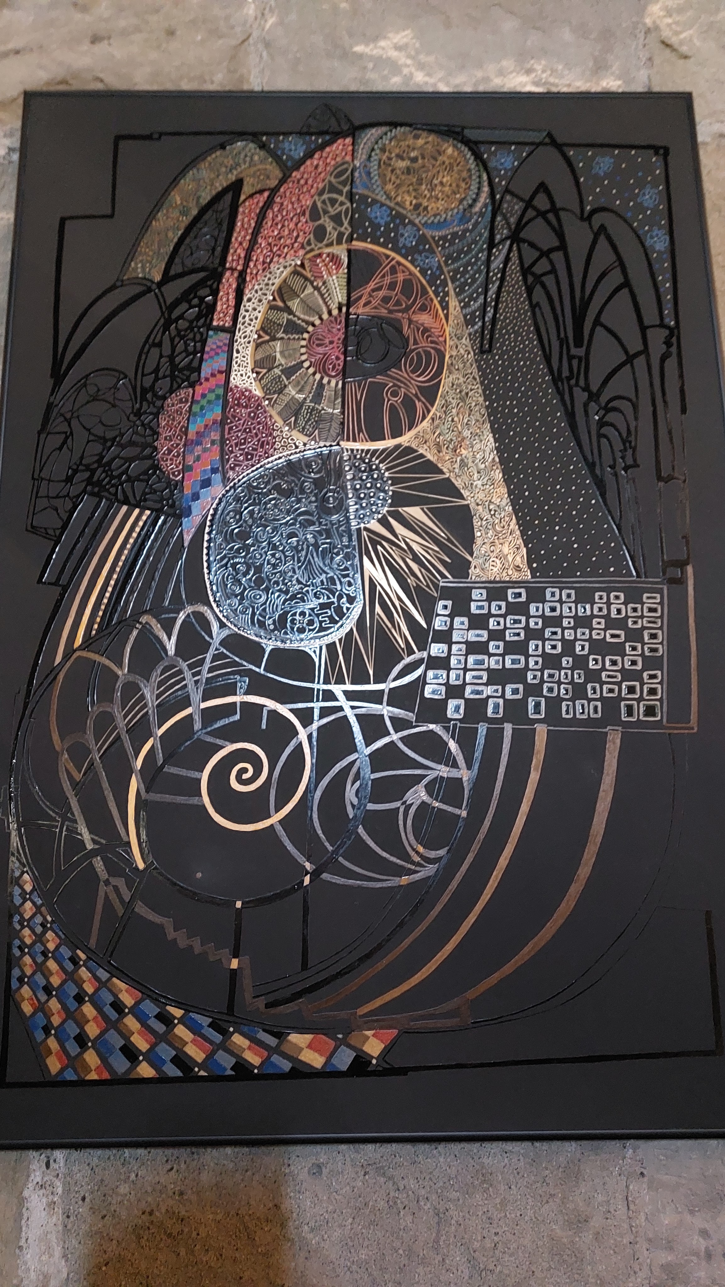 Al piano superiore si possono ammirare due disegni a smalto su cartoncino provenienti dalla mostra Boston Como (2013), che rappresentano due cattedrali gotiche, e un’altra formella polimaterica proveniente da Bologna Arte Fiera, in ceramica assemblata con legno, raffigurante una dama in una Scena medioevale.