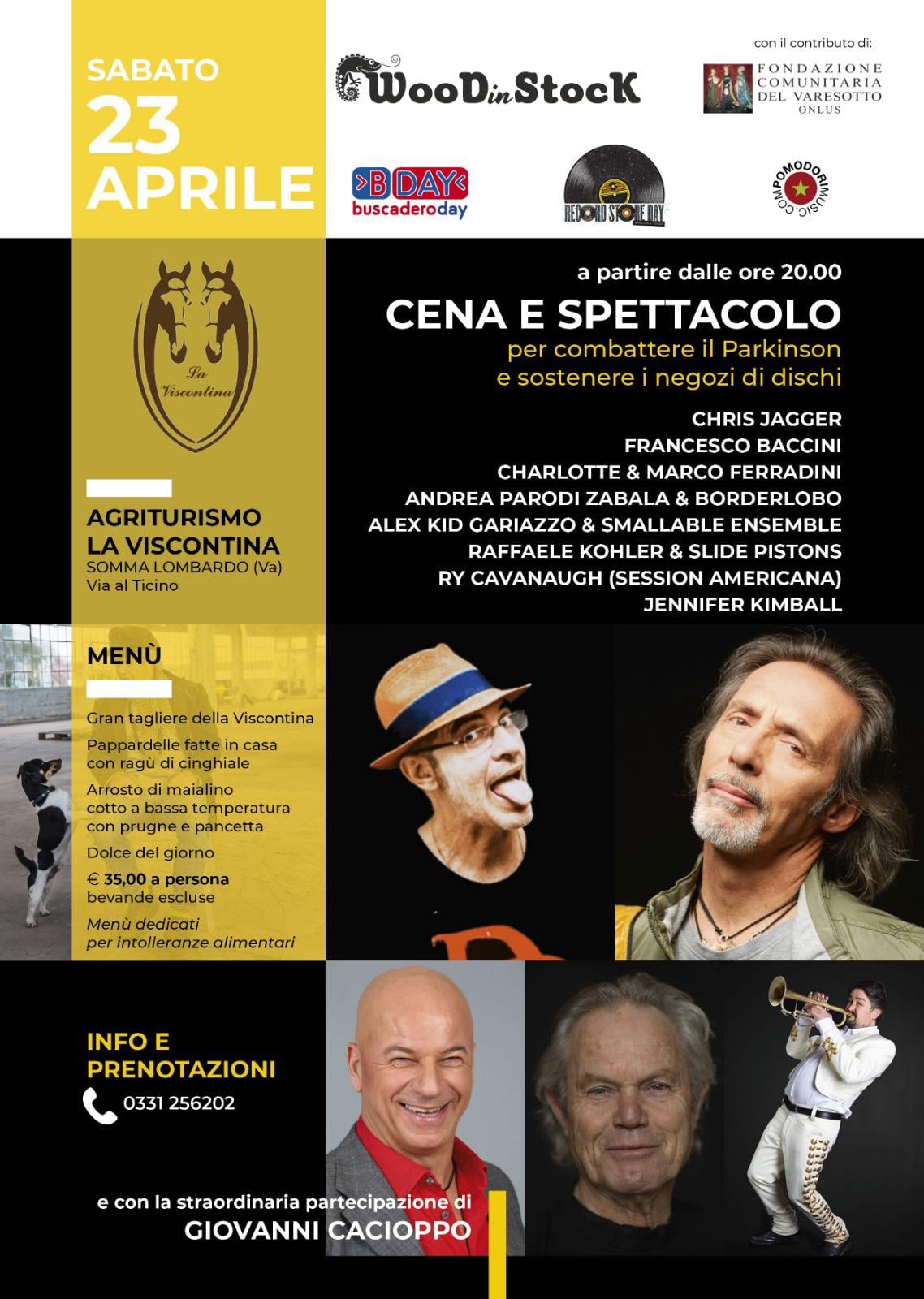In serata ci sposteremo poi a Somma Lombardo, all’agriturismo La Viscontina, per una serata (che prevede anche una cena) i cui proventi saranno devoluti alla lotta al Parkinson, in collaborazione con l’associazione Woodinstock. Il cast sarà molto variegato: Chris Jagger, Marco e Marta Ferradini, Francesco Baccini, il comico di Zelig Giovanni Cacioppo ed una super band con Alex Gariazzo, Paolo Ercoli, Raffaele Kohler, Luciano Macchia e molti altri straordinari musicisti. Lo stesso giorno parte il tour di Chris Jagger, che sarà per una settimana in Italia, e poi a maggio… succederà di tutto!