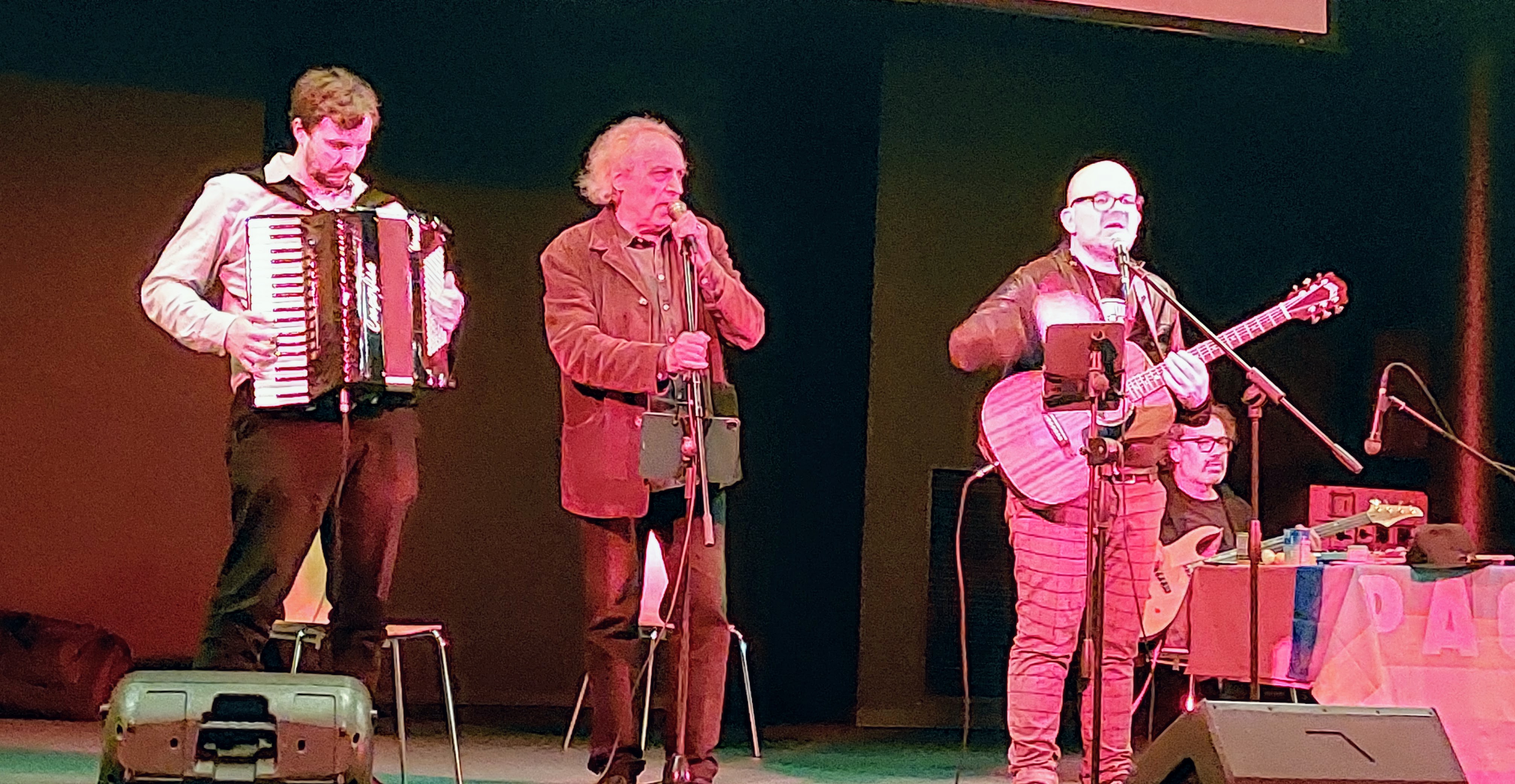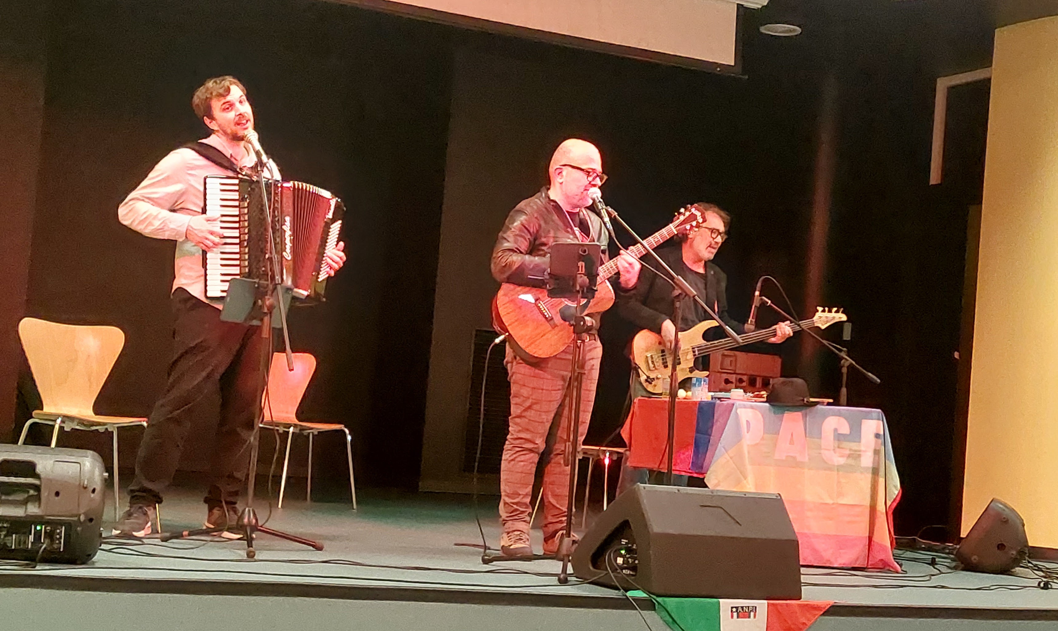 I toni delle canzoni sono differenti: battaglieri, sentimentali, satirici o nostalgici. Nell’epoca della guerra civile, i canti rappresentavano infatti, a vario titolo, i sentimenti della collettività e accompagnavano la quotidianità dei combattenti, durante le estenuanti marce o durante le azioni; al tempo stesso, le canzoni rievocavano episodi, personaggi, tragedie, ma esprimevano anche nostalgia, amore, ribellione. Lega ha riportato alla luce anche le vicende degli scugnizzi che combatterono per la liberazione di Napoli e ha reso omaggio alla Resistenza francese, con Le Partisan, che venne tradotta in inglese da Leonard Cohen. Espressione di un’altra Resistenza, quella che chiede dignità per tutti gli individui garantendo il diritto al lavoro, è O cara moglie di Ivan Dalla Mea, un brano che non manca mai nelle setlist del musicista; il concerto si è poi concluso con l’interpretazione di un pezzo su uno degli episodi più toccanti della storia della Liberazione, l’eccidio dei sette fratelli Cervi, tradotto in poesia da Marino Severini dei Gang ne La pianura dei sette fratelli. Nel finale non poteva mancare Bella Ciao, canzone che, come l’ha definita Carlo Pestelli, autore di un libro ad essa dedicato, è “un piccolo bene immateriale, che agisce sulla coscienza come qualcosa che arriva da lontano, quasi a segnare il confine tra la guerra e la nuova primavera dei popoli; un’elegia del presente che è anche, e sempre, una continua rinascita della storia della libertà”. Per questi ultimi due brani Alessio Lega ha invitato sul palco Renato Franchi, cantautore locale sempre molto attivo sul territorio nelle iniziative legate alla memoria storica e quindi presenza estremamente significativa.