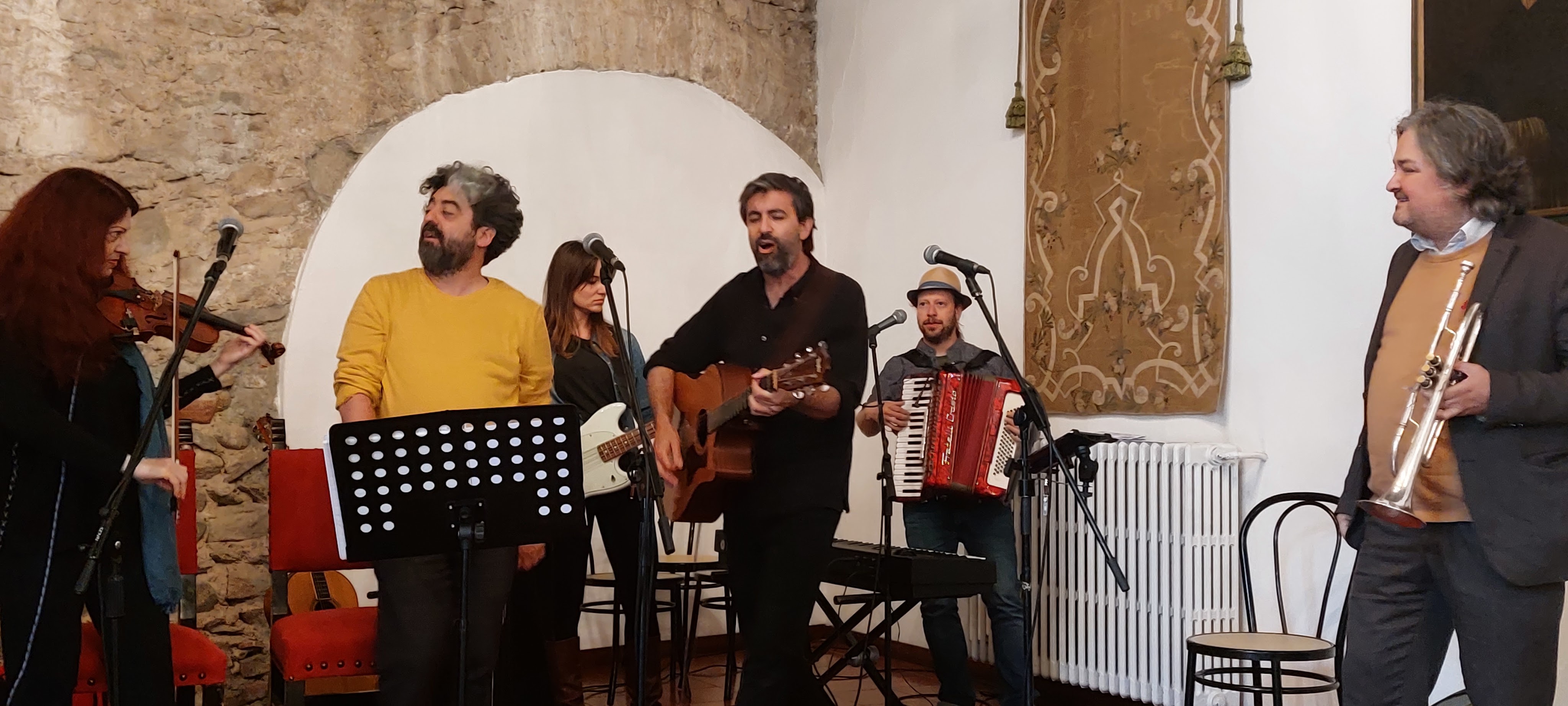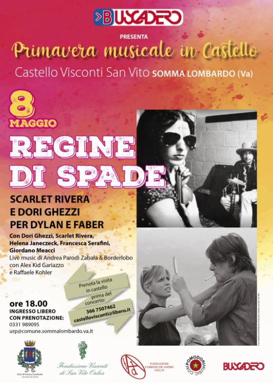 Parole e musica per ricordare Fabrizio De André e Bob Dylan attraverso le testimonianze di due figure femminili che con questi due straordinari cantautori hanno condiviso una parte significativa della propria vita. Un evento d’eccezione, nella splendida cornice del castello Visconti di San Vito, è quello che ha avuto luogo ieri a Somma Lombardo: Dori Ghezzi e Scarlet Rivera hanno reso omaggio al talento e alle immortali canzoni di Faber e di Dylan, dialogando con gli scrittori Giordano Meacci e Francesca Serafini (coautori dell’autobiografia della Ghezzi Lui, io, noi) ed Helena Janacezk. Andrea Parodi e i suoi Borderlobo (Alex Gariazzo alla chitarra, Angie al basso, Riccardo Maccabruni alla fisarmonica e tastiera e l’immancabile tromba di Raffaele Kohler), insieme al mitico violino di Scarlet, hanno accompagnato gli spettatori in un suggestivo viaggio nel mondo incantato di due tra i più grandi songwriters di sempre.