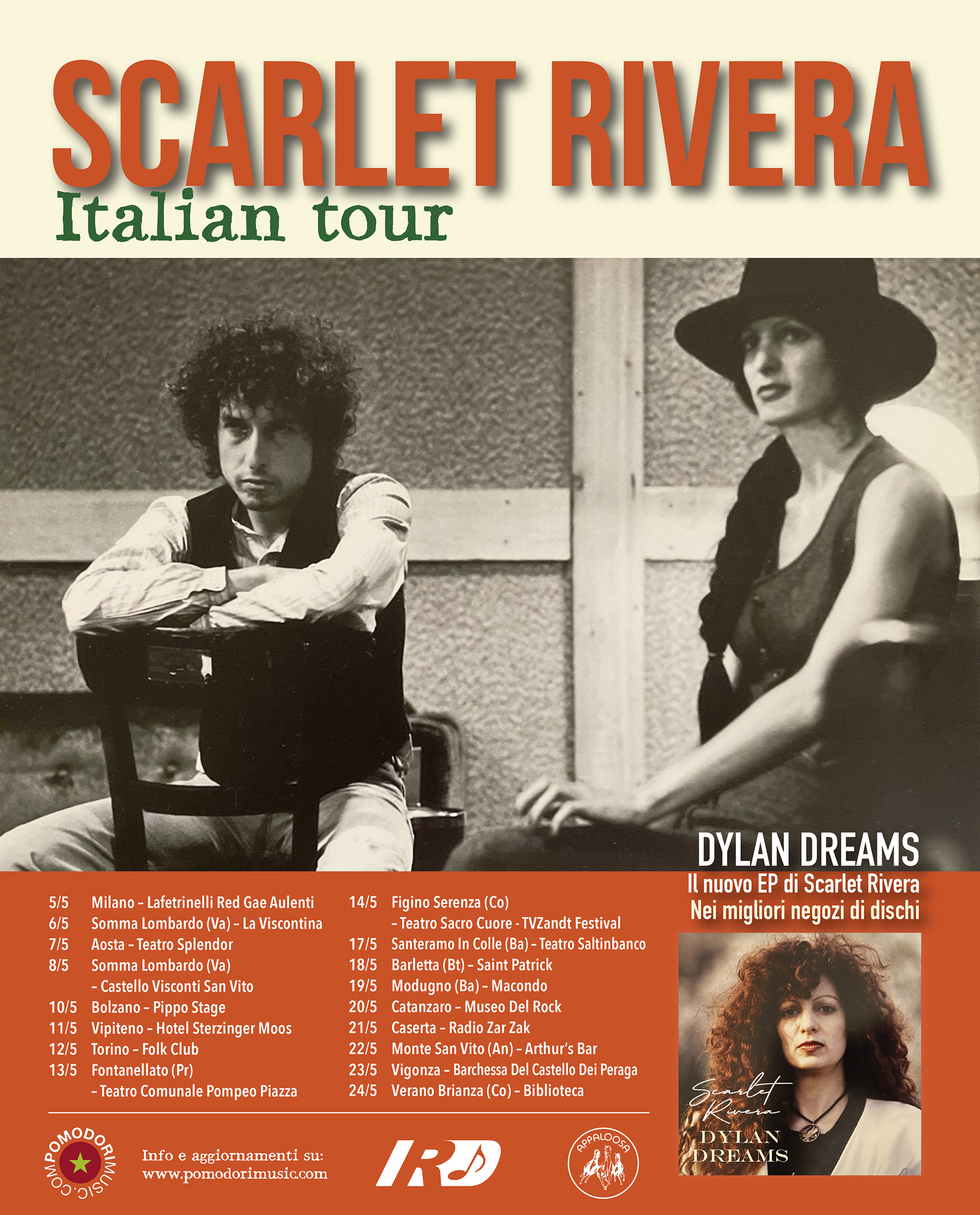 Per Scarlet Rivera si trattava della quarta tappa del suo tour italiano, che in questo mese la vedrà impegnata in moltissime serate lungo la nostra penisola e durante il quale condividerà spesso il palco con Thom Chacon, cantautore originario di Durango. La violinista sarà inoltre una dei protagonisti del Townes Van Zandt Festival, l’annuale appuntamento della kermesse dedicata al songwriter americano, che si terrà sabato 14 maggio a Figino Serenza.