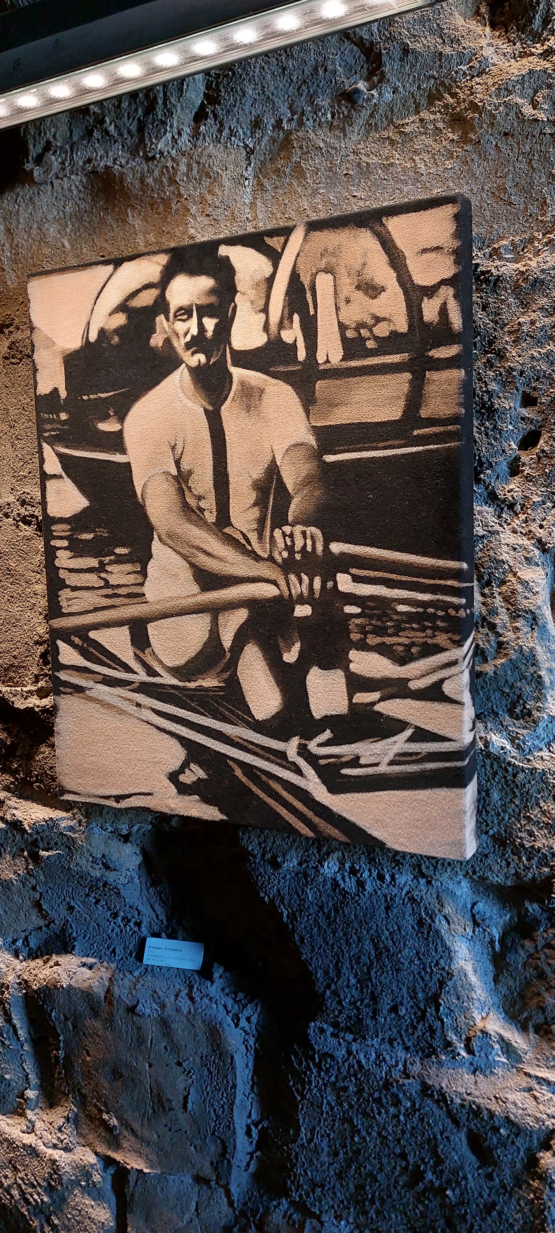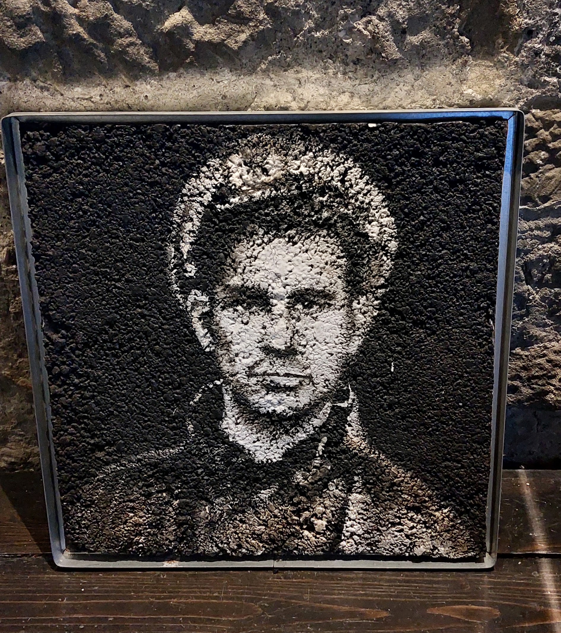 Asfalto e fustagno sono due dei materiali che Cazzaniga predilige e pertanto la maggior parte delle opere esposte è realizzata con queste sostanze. I due ritratti di Jack Kerouac (che, autore di On The Road, rievoca il concetto di “strada”) e di David Lynch (mi chiedo, e dovrei chiedere conferma all’artista, se il regista sia stato prescelto perché autore di un film che ha come soggetto, una celeberrima e lunga via losangelina, Mullholland Drive) sono realizzati, appunto, su asfalto.