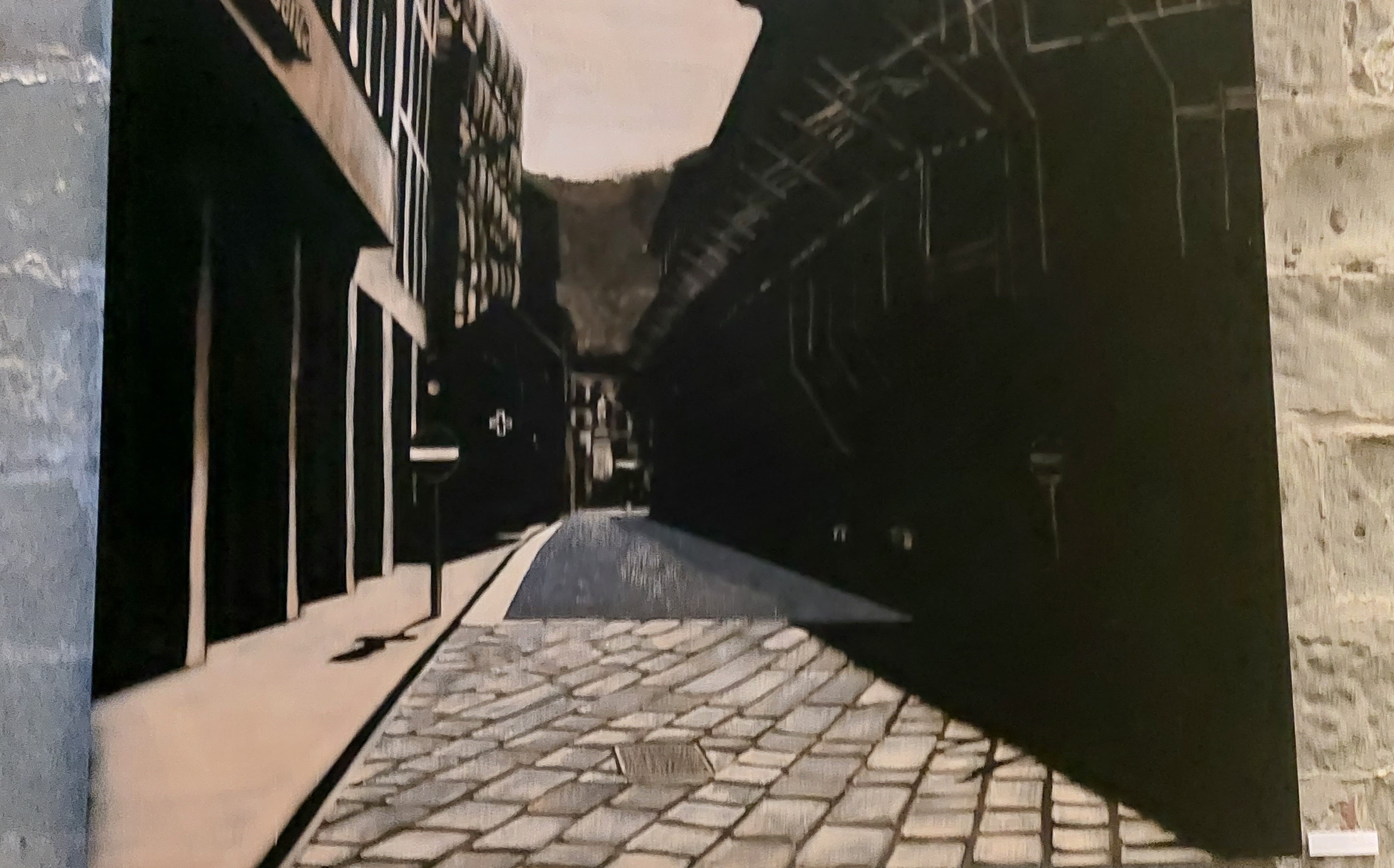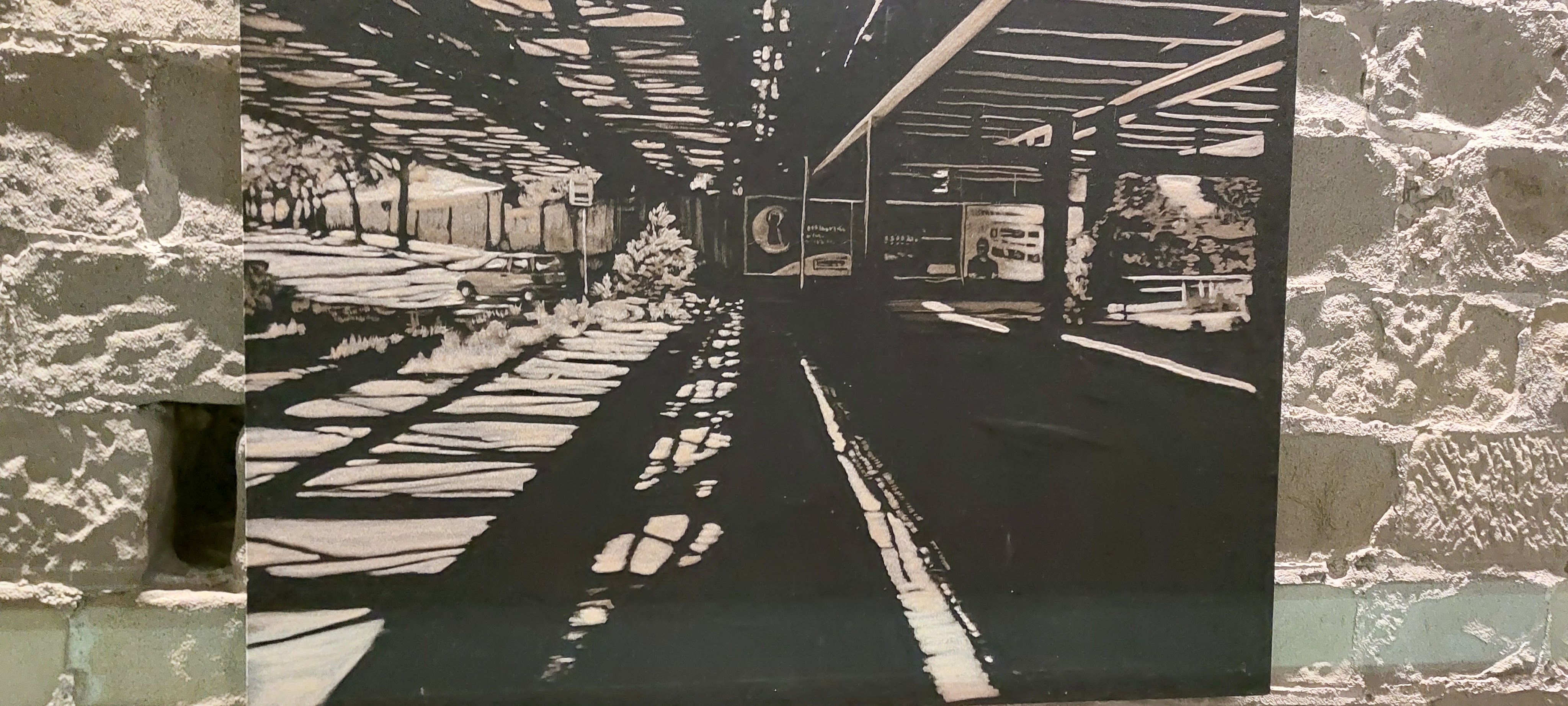 I pannelli in fustagno nero, sui quali Cazzaniga “disegna” con un pennello intriso di candeggina, sottraendo il colore, hanno una qualità quasi fotografica nella precisione con cui i soggetti sono raffigurati e nel gioco di chiaroscuri. Il primo è intitolato Via Fontana (con asfalto?) e rappresenta una strada del centro storico del capoluogo lariano, in cui le persistenti impalcature e una striscia di asfalto (qui realizzata con uno strato di microasfalto) deturpavano il contesto (l’opera è del 2013). Dello stesso anno, un altro scenario urbano, un Sottoponte berlinese.