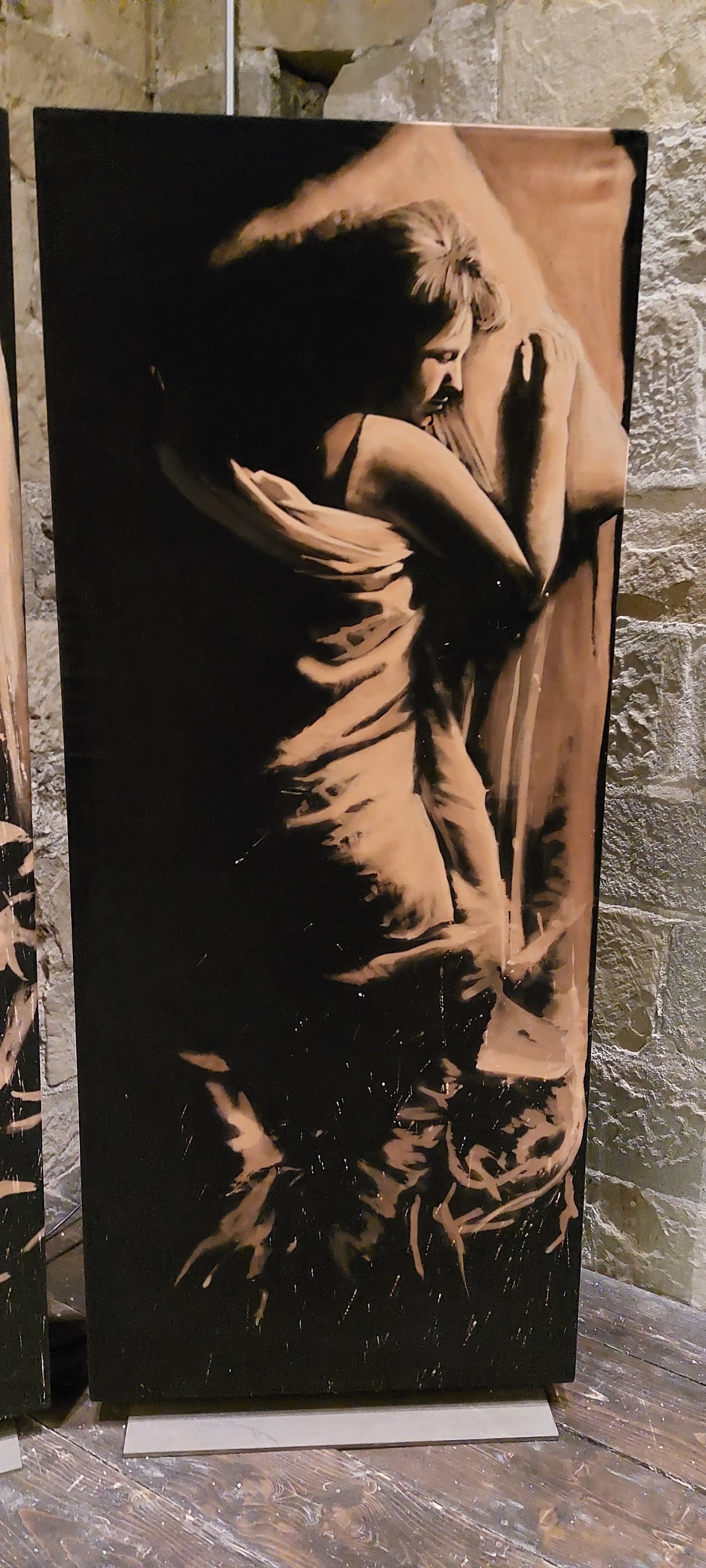 Due pannelli verticali raffigurano poi una coppia di dormienti: il titolo, Togliere al sonno, rimanda all’operare per “sottrazione” proprio della candeggina che toglie il colore della stoffa, delineando le immagini.