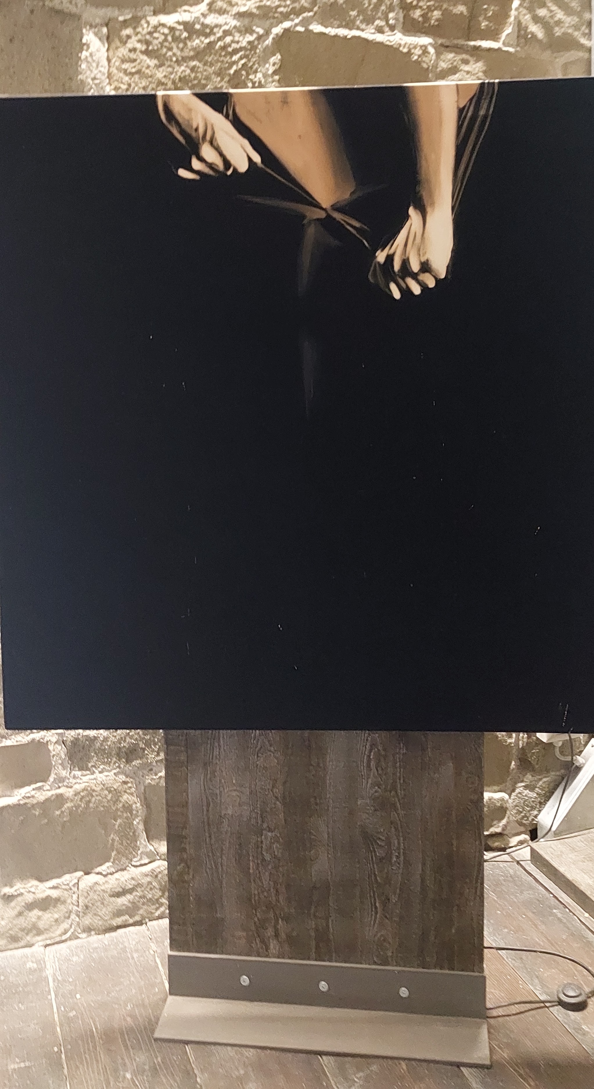 Nella stessa stanza, altri due pannelli di grandi dimensioni rappresentano l’illusione ottica che la tela venga strappata da una persona posizionata dietro di essa.
