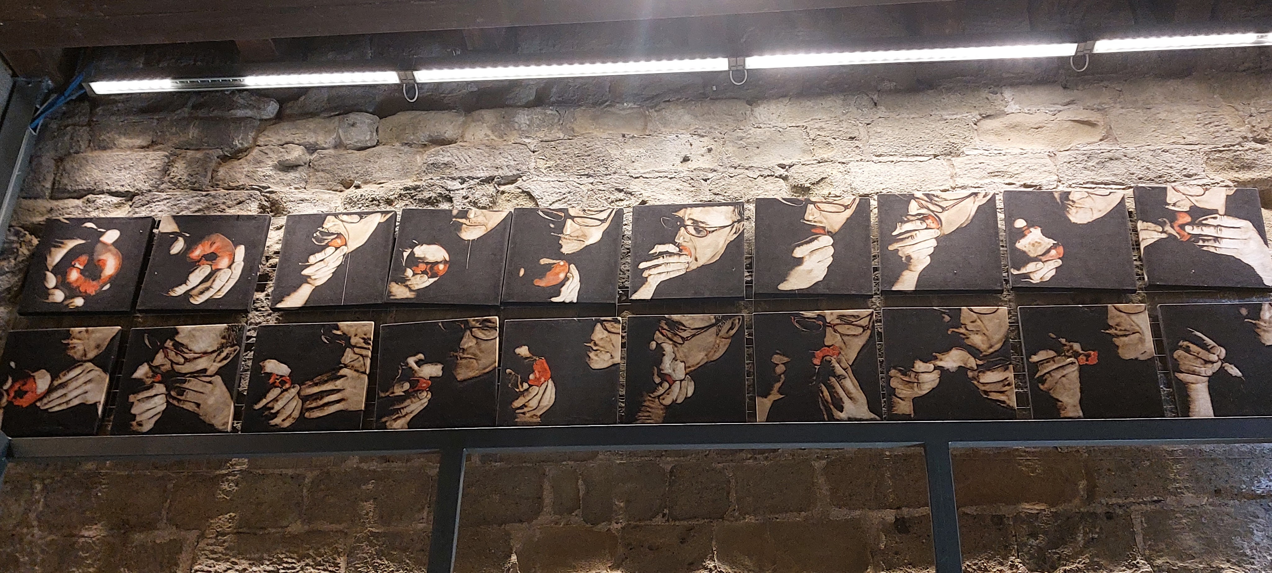 Si prosegue con Togliere alla mela, una serie di 20 pannelli di 40×40 cm, in cui il particolare inedito è l’utilizzo del pastello rosso per dare colore al frutto morso da una figura maschile. Si tratta di una sequenza di immagini, simili a scatti fotografici, in cui la mela viene progressivamente addentata.