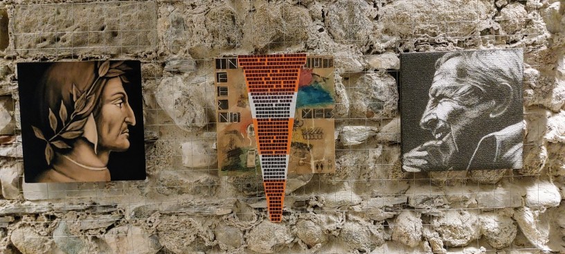 Il trait d’union tra i lavori dei due artisti è costituito da un omaggio che Cazzaniga ha voluto dedicare a Rauschenberg, vale a dire un trittico che affianca il ritratto del Sommo poeta a quello dell’artista americano, inframmezzati dall’immagine di un cono stradale rovesciato che rimanda alla struttura dell’oltremondo infernale dantesco. Quindici anni fa, nel 2007, il comasco aveva reso un altro tributo all’estetica di Rauschenberg nell’omonimo villaggio, situato in Assia, nel cuore della Germania.