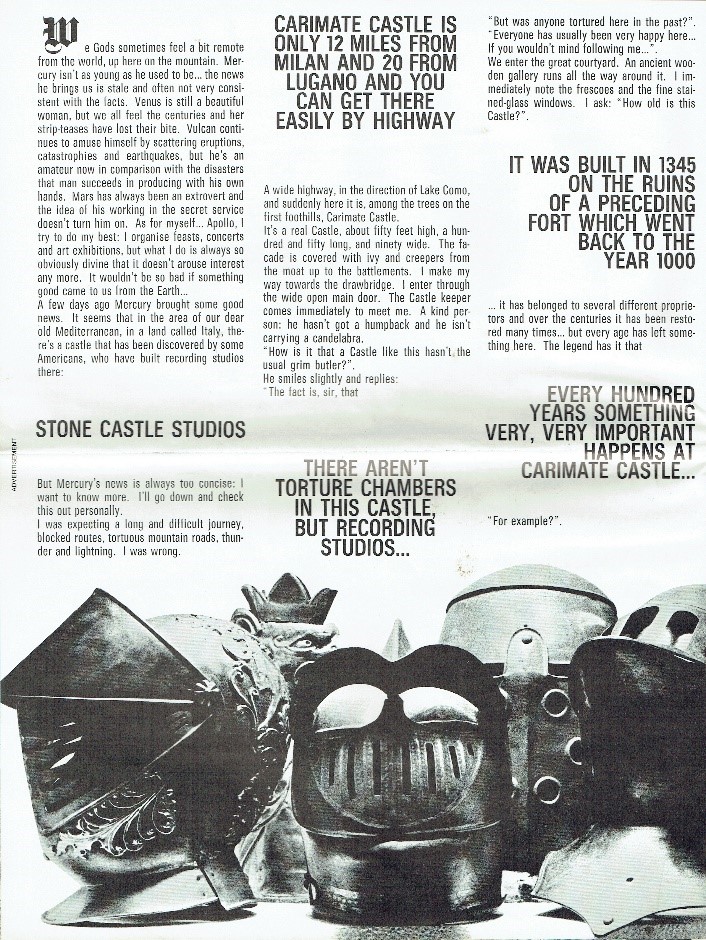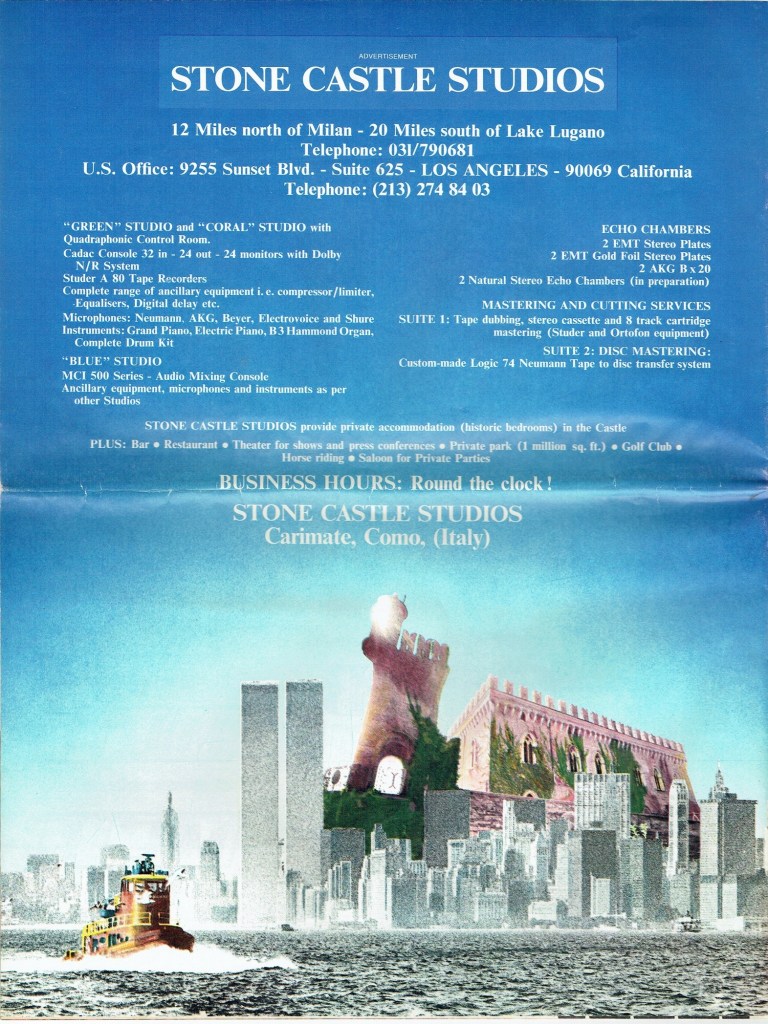 Un’importante attività di ricerca sugli Stone Castle Studios è stata recentemente condotta da Walter Pistarini, scrittore e collezionista, autore dei volumi Fabrizio De André – Il libro del mondo – Le storie dietro le canzoni (Giunti) e il recente, monumentale Collezionare de André (ed. Ego Sum), scritto a quattro mani con Claudio Sassi. Nel libro Bluebell, Produttori Associati, Stone Castle Studios – il mondo di Antonio Casetta, di prossima pubblicazione, l’autore (che ringrazio per avermi fatto visionare in anteprima il lavoro da lui svolto) ha dedicato ampio spazio all’avventura degli Studios. Casetta, imprenditore milanese scomparso nel 1993, aveva acquistato il castello con l’intento di allestirvi, oltre alle sale di incisione, una parte dove far alloggiare i musicisti e delle location per servizi fotografici. Qui organizzava, inoltre, le convention con i rappresentanti della distribuzione Ricordi (alla quale la Bluebell era associata) e allestiva sontuosi buffet. Pistarini ha esaminato un’ampia serie di documenti e ha riportato numerose testimonianze dell’epoca, da cui emerge che l’intento di Casetta fosse quello di realizzare, anche con l’apporto di capitali stranieri, uno studio di registrazione avveniristico in grado di competere con i migliori impianti europei. Gli Stone Castle Studios furono assemblati dalla statunitense East Lake Studios e una significativa inserzione sull’argomento venne pubblicata dalla rivista “Billboard” sia nel 1977 che nel 1979, per favorire il lancio promozionale internazionale della struttura. La pagina pubblicitaria sul periodico americano, curata da Cesare Monti ed il cui testo venne scritto da Gianfranco Manfredi, non mancava di esaltare l’elevata qualità ed i prezzi concorrenziali dell’impianto.