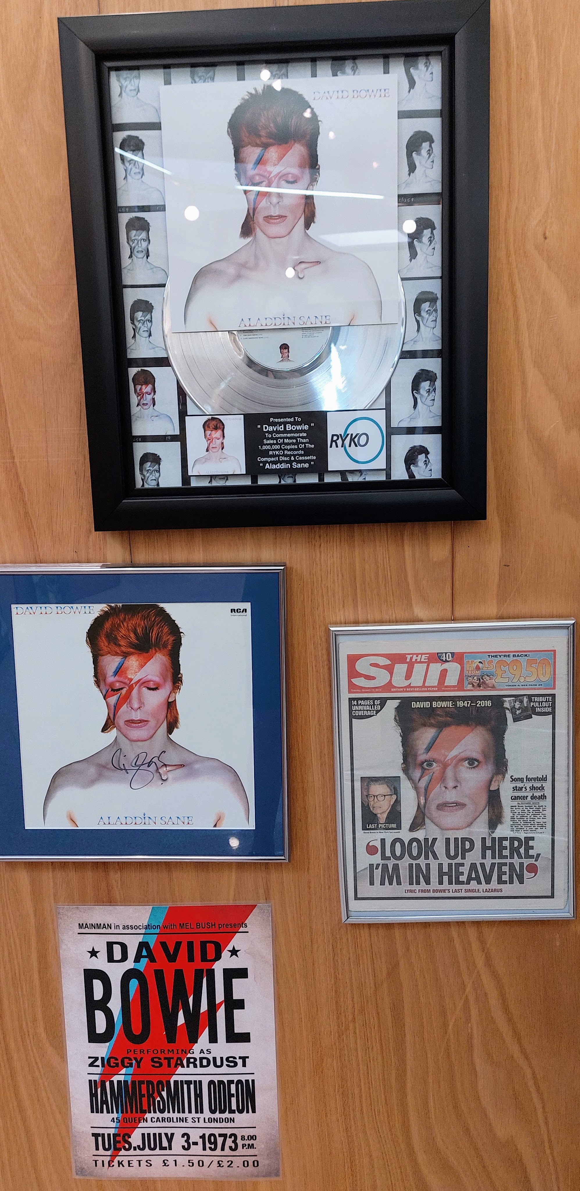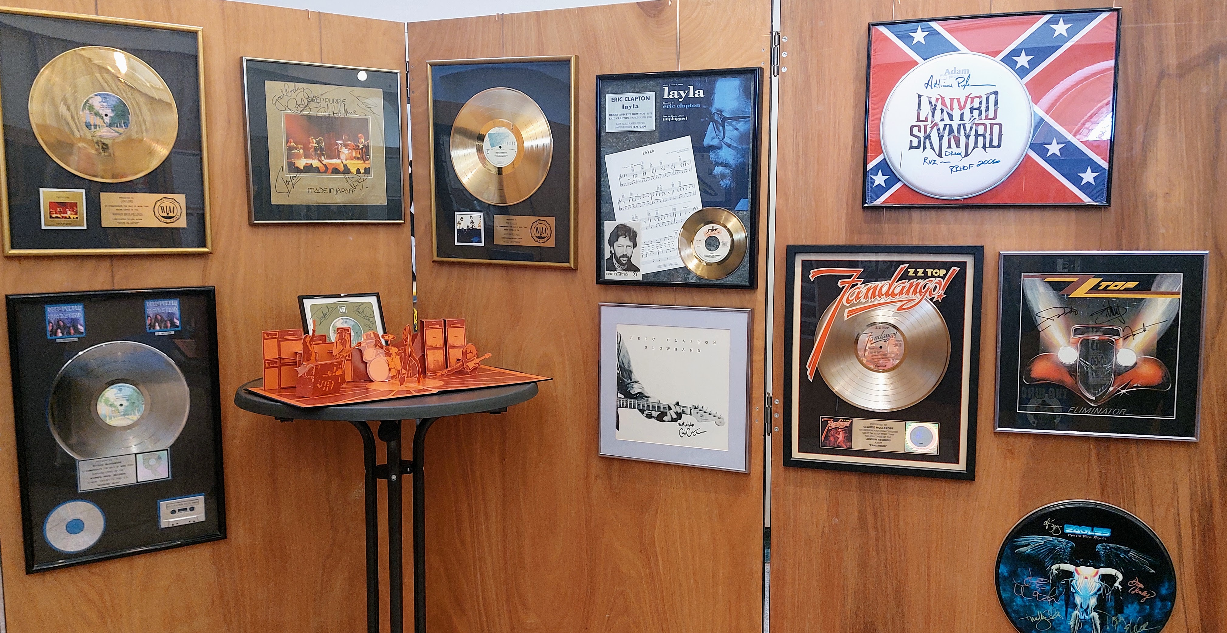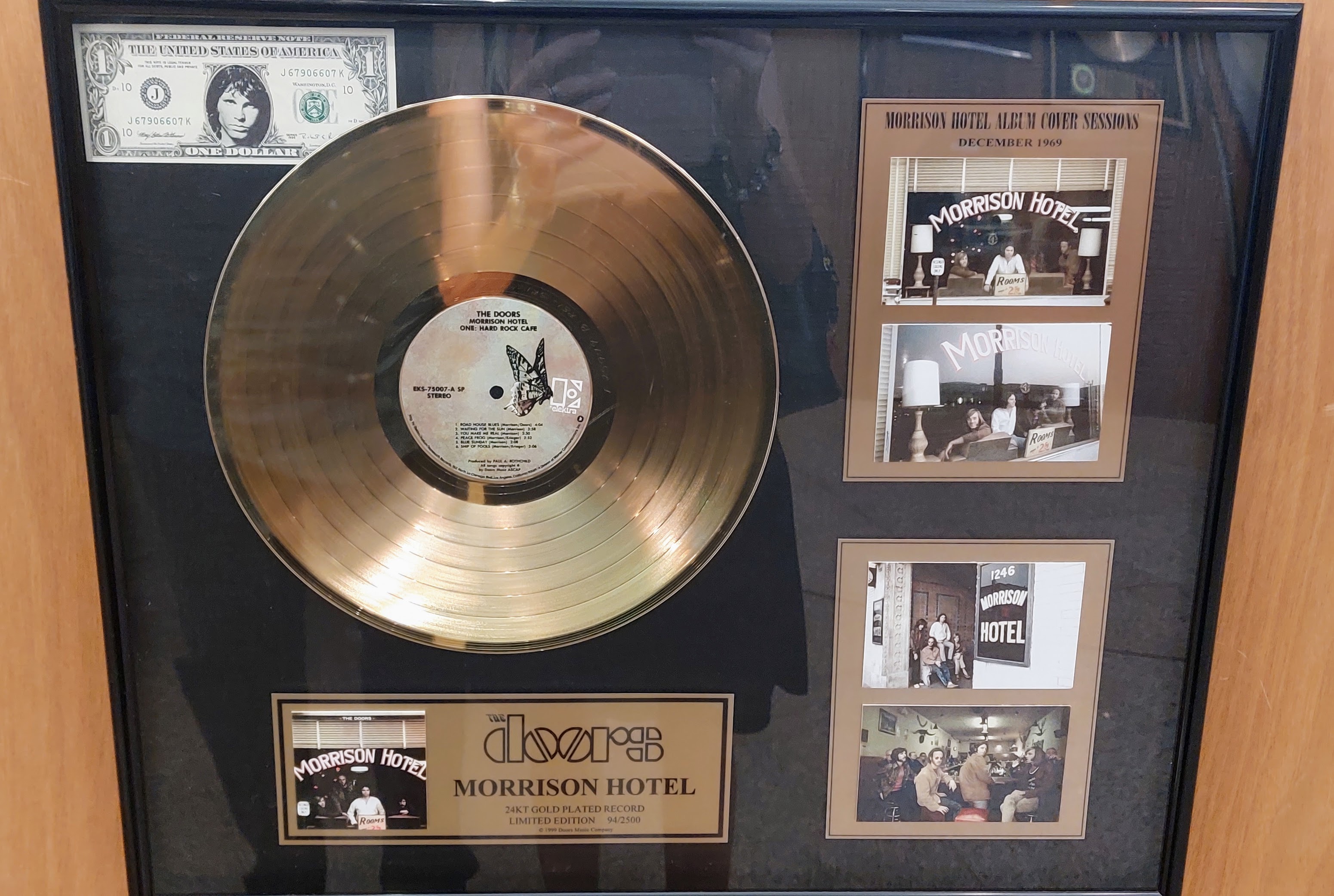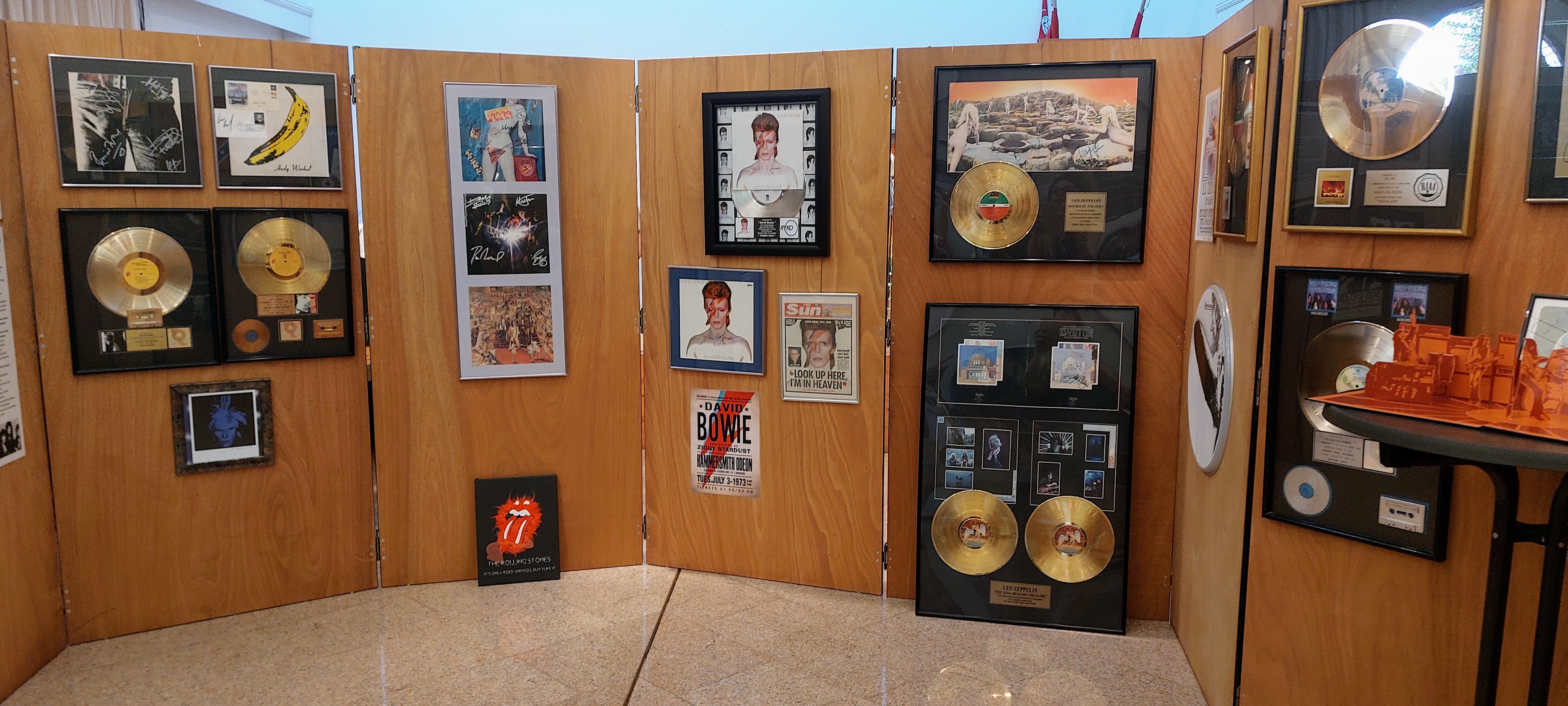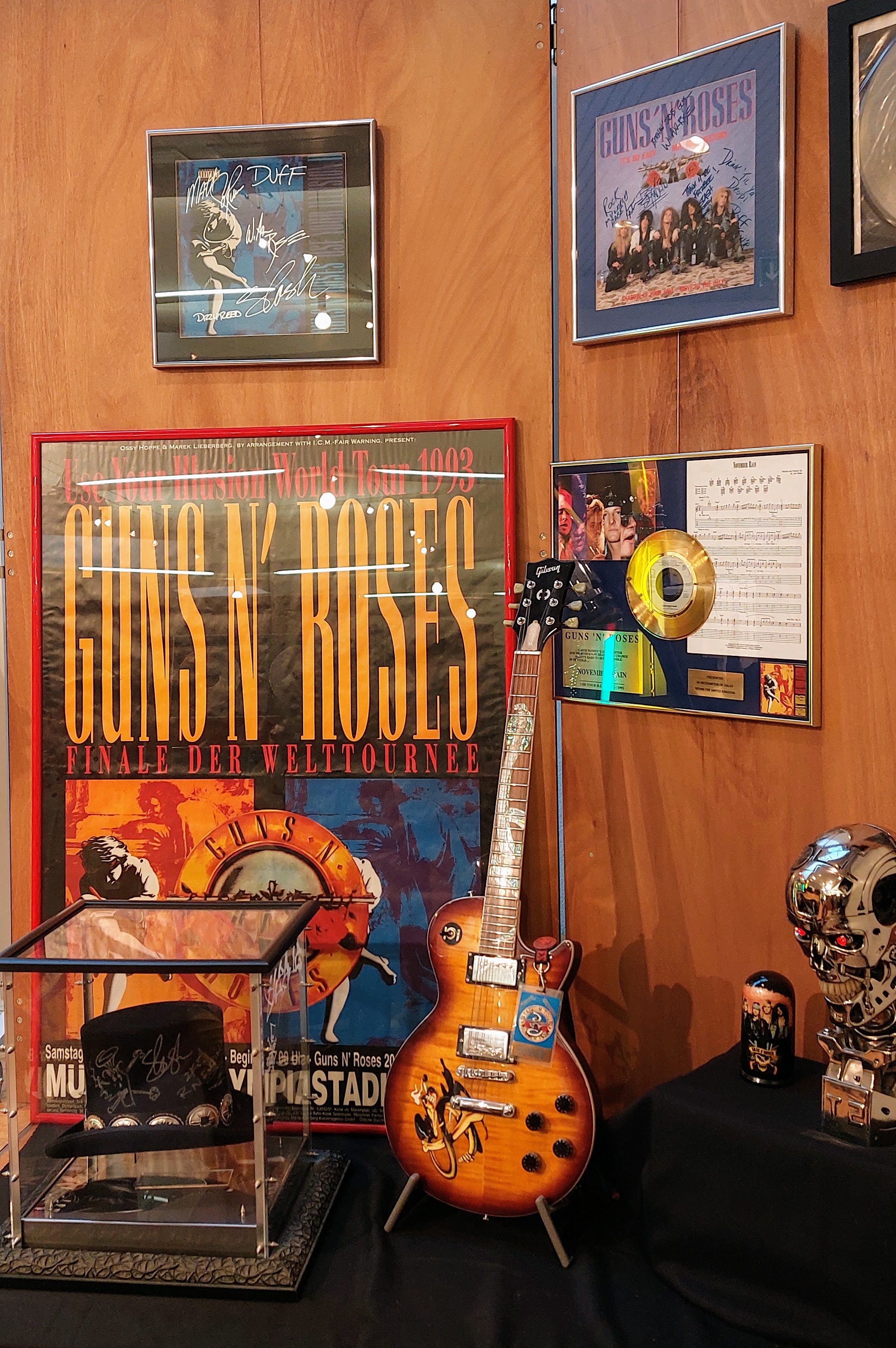 Claudio Mollekopf ed Eros Girardi, grandi appassionati di rock fin da ragazzini, hanno messo a disposizione parte della loro collezione – composta da innumerevoli dischi autografati, dischi d’oro, locandine, strumenti musicali ed altri pezzi di grande valore – messa insieme in quattro decenni trascorsi tra concerti, viaggi, acquisti, scambi e frequentazioni di aste, fiere del disco e mercatini di oggetti vintage. A Morcote, quindi, è possibile vedere una chitarra di Keith Richards, una firmata da Alice Cooper contenuta in una poco rassicurante “Coffin Case”, il basso di Gene Simmons dei Kiss modello “Cort Axe” ed una replica della Fender Stratocaster utilizzata da Jimi Hendrix all’isola di Wight nel 1970. Moltissimi i dischi d’oro e di platino, realizzati dalle case discografiche in un limitatissimo numero di pezzi per celebrare i record di vendite degli album e spesso non ritirati dagli stessi artisti e di conseguenza immessi sul mercato del collezionismo, come ha spiegato Mollekopf. Tra questi, l’MTV Platinum Award assegnato a David Bowie, il disco d’oro di Morrison Hotel dei Doors con una speciale photo session del 1969 e il “RIIA Award” della Capitol Records attribuito ai Beatles per The Beatles – 20 Greatest Hits.