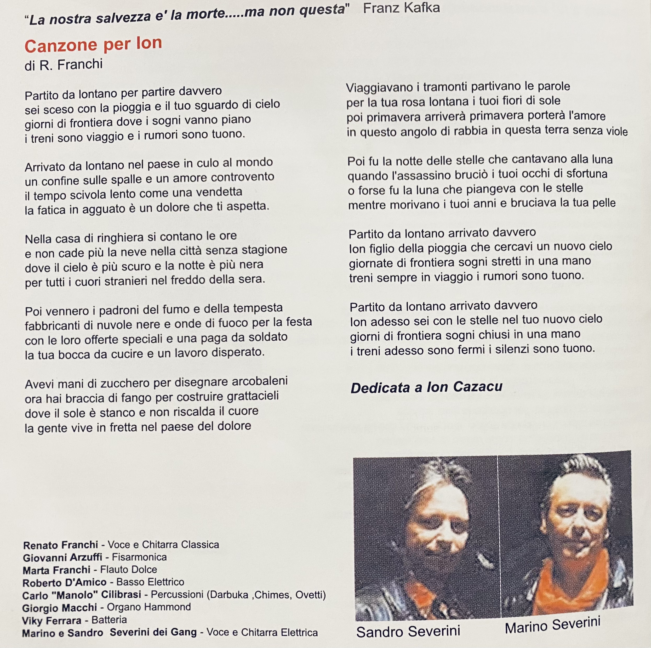 Due grandi amici, i fratelli Marino e Sandro Severini dei Gang, costituiscono poi un valore aggiunto per due degli episodi migliori di tutto l’album. Il primo è Canzone per Ion, dedicata alla memoria di Ion Cazacu, operaio rumeno arso vivo sul posto di lavoro, una delle innumerevoli vittime dell’incuria e della mancata tutela delle norme di sicurezza. La figura del ragazzo è tratteggiata con delicatezza ed anche la sua drammatica fine è rievocata con i toni della poesia: