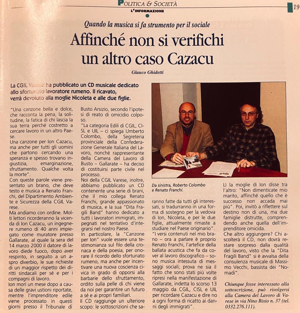 Il brano, accreditato a “Renato Franchi e Dita Fragili Band”, è stato inserito in un EP con altre tre tracce, prodotto dalla CGIL di Varese e pubblicato nell’ottobre 2000. L’iniziativa discografica, realizzata con la consulenza musicale di Massimo Vecchi, bassista dei Nomadi, riscosse un notevole successo. Il CD e la canzone ebbero un impatto notevole a livello nazionale, che produsse una importante e significativa dimostrazione di sostegno e solidarietà verso la famiglia Cazacu. Si arrivò, infatti, a superare la richiesta di oltre 7000 copie del disco a titolo di sottoscrizione in sostegno della complessa e difficile battaglia legale. Importante poi, in ragione delle azioni legali e delle iniziative sindacali intraprese, fu il riconoscimento per la tragedia di Ion, pur non essendo avvenuta in un luogo di lavoro, di infortunio mortale da parte dell’INAIL (Istituto Nazionale Assicurazione Infortuni sul Lavoro).