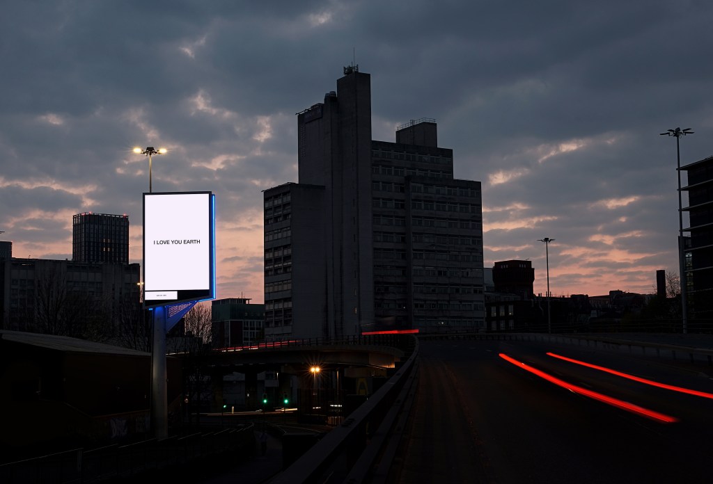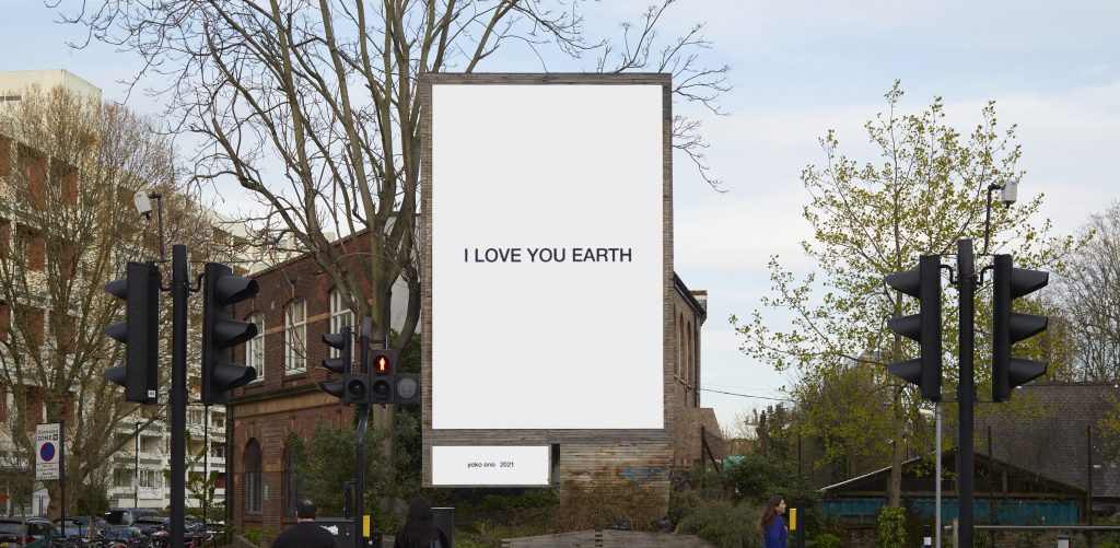 Si tratta di una tipologia di intervento che ricorda i manifesti con la scritta “War Is Over” affissi nel 1969 per iniziativa di John Lennon e della stessa Yoko come invito a fermare la guerra del Vietnam. Concepita originariamente come titolo della traccia dell’album “Starpeace” (1985), poi ripubblicata in “Warzone” (2018), già utilizzata in una campagna del 2017, la frase “I Love You Earth” è stata tradotta in opera d’arte in occasione dell’Earth Day, per due settimane, nel mese di aprile 2021.Organizzata dalle Serpentine Galleries nell’ambito di “Back to Earth”, un progetto che invitava poeti, artisti, architetti e scienziati a offrire il loro contributo per un mondo migliore, la rassegna si è sviluppata “occupando” una serie di spazi pubblicitari all’aperto, convertendoli in grandi “vetrine” con slogan dedicati all’amore per il pianeta Terra.