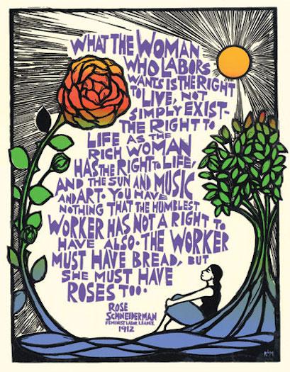 Saltando al Novecento, “Il pane e le rose” è un famoso slogan tratto da una poesia di James Oppenheim, adottato dal movimento operaio e da quello per l’emancipazione femminile a partire dal 1911-12, a voler significare il bisogno di bellezza che caratterizza ogni essere umano, al di là del soddisfacimento dei bisogni primari. La frase riporta un pensiero di Karl Marx: “pane e rose, il necessario e il superfluo, una società dove si mangia meglio e di più (non solo pane), dove si lavora meglio e di meno, ma anche una società dove si è più felici, realizzati, liberi” – ed è tradizionalmente associata, oltre che alla figura dell’attivista per il voto alle donne Rose Schneiderman, allo sciopero delle lavoratrici tessili delle fabbriche di Lawrence, Massachusetts, che ebbe luogo il 12 gennaio 1912. Su uno degli striscioni campeggiava l’asserzione poi passata alla storia: “We want bread and roses too” (“Vogliamo il pane ma anche le rose”). Il regista Ken Loach l’ha poi ripresa nel titolo del suo film “Bread and Roses” (2000), dedicato alle lotte dei lavoratori immigrati del settore delle pulizie per ottenere tutela sindacale e condizioni più eque.