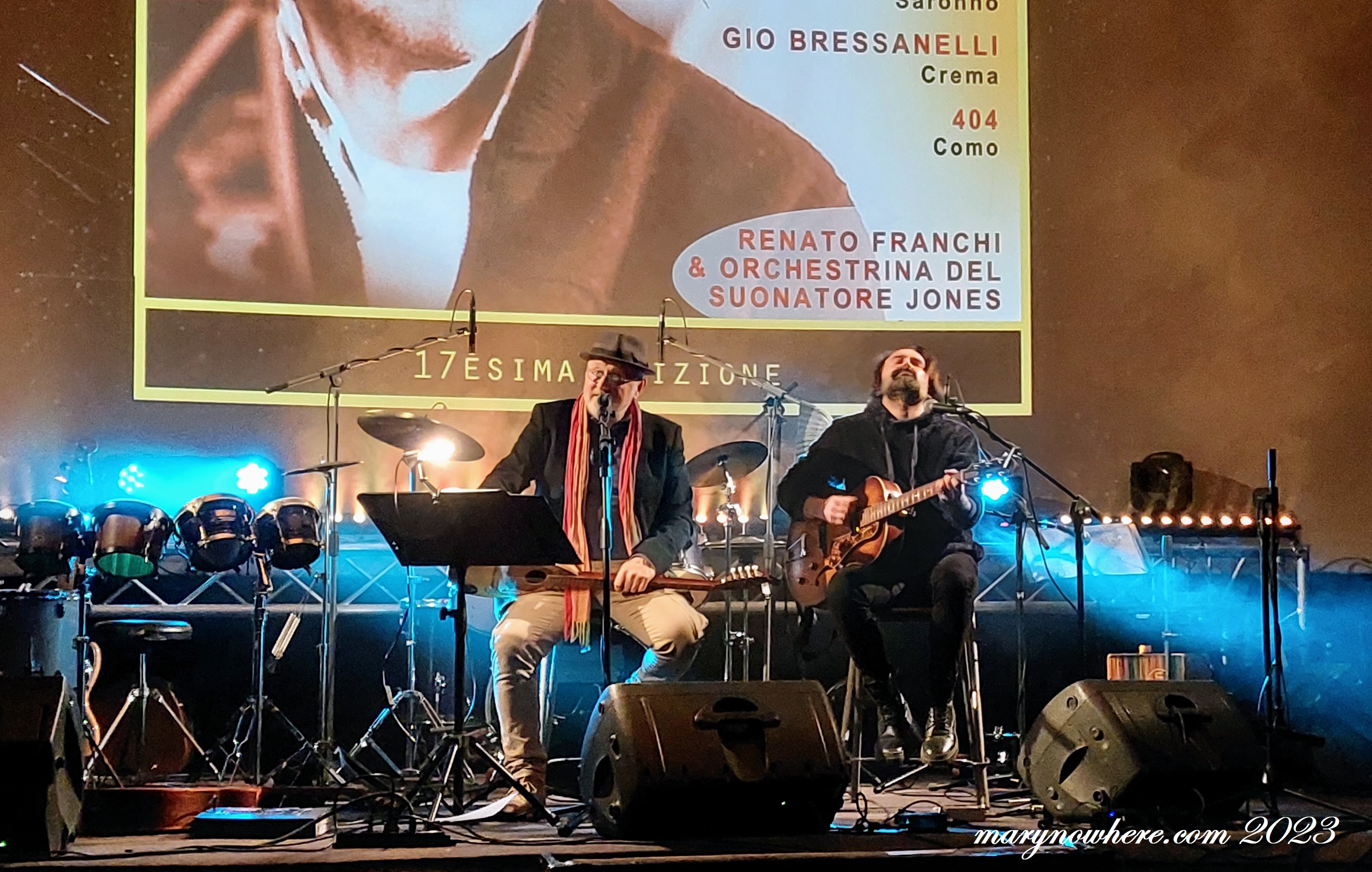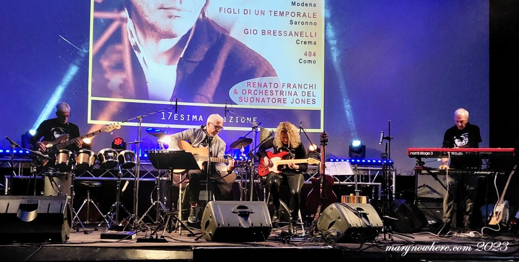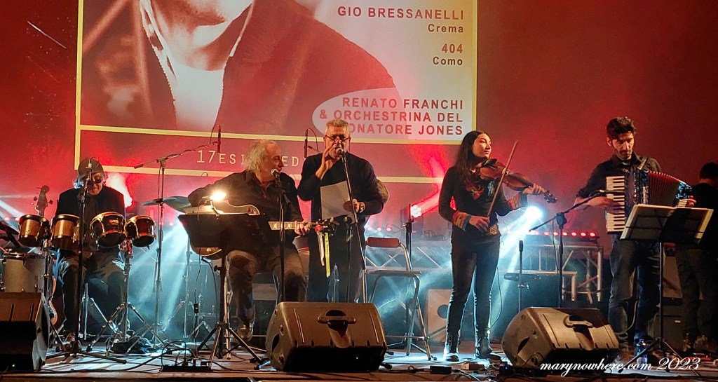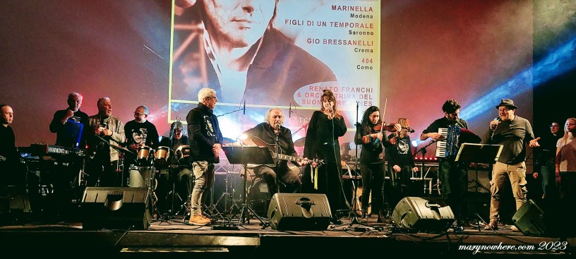 A chiudere la serata, come è avvenuto a Segrate l’altra sera, la ‘resident band’ del tributo comasco a Faber, vale a dire l’Orchestrina del Suonatore Jones di Renato Franchi, che è anche direttore artistico della manifestazione. L’ensemble si è presentato in versione ‘full band’ con sette elementi. Il loro set si è aperto con Dall’altra parte del vento, che Massimo Bubola volle dedicare nel 2008 all’amico e collaboratore per ricordare la sua prematura scomparsa:
