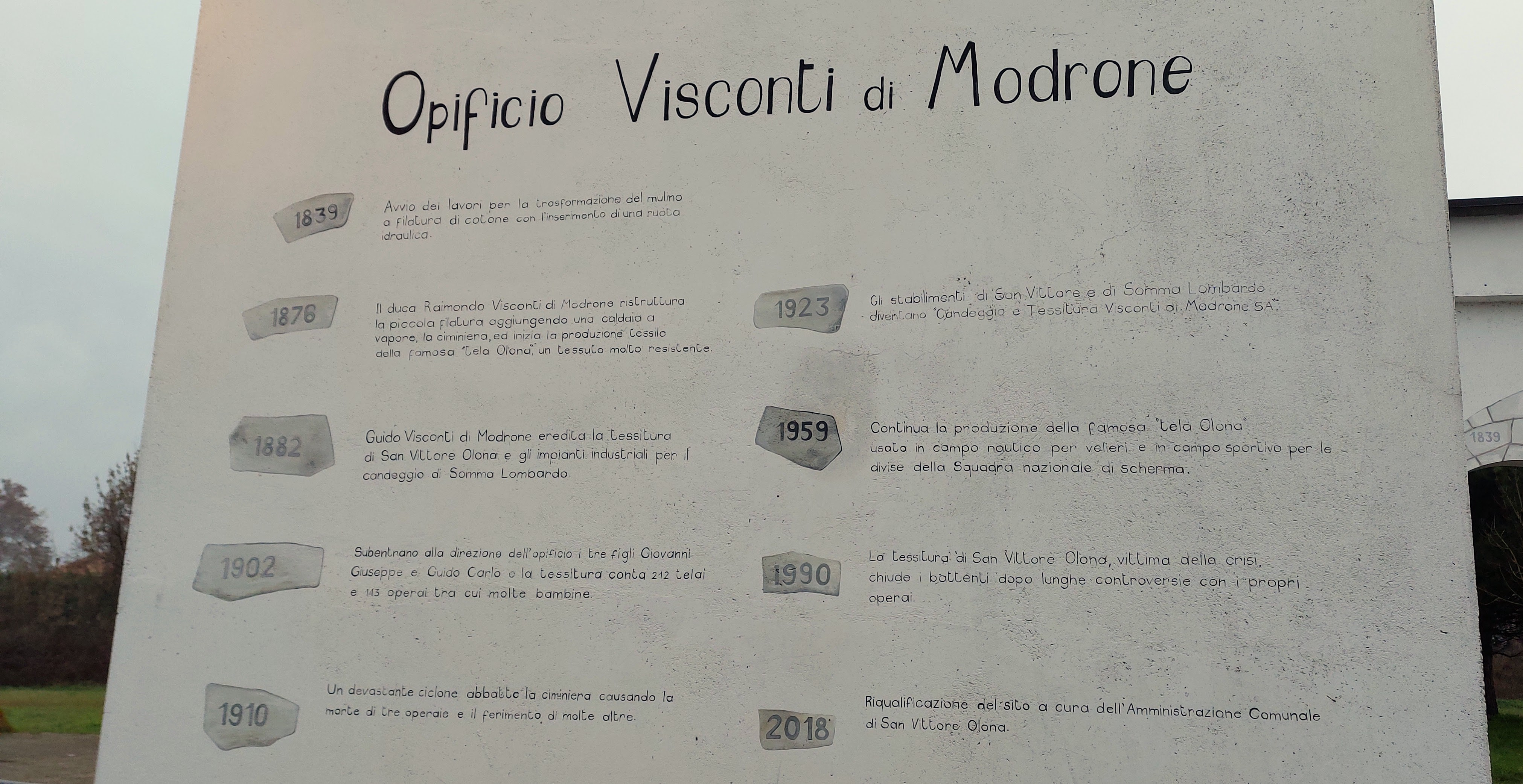 Presso il Consorzio del Fiume Olona è conservata la documentazione che descrive gli inizi dell’attività tessile a San Vittore. Nel secolo XIX i duchi Visconti di Modrone erano i proprietari dei campi da San Vittore a Canegrate e dei tradizionali mulini. Inizialmente i Duchi decisero di adattare uno di essi per la filatura di cotone e tra i lavori di ristrutturazione ci fu l’aggiunta di una ruota idraulica in ferro. La nobile famiglia milanese poi acquistò il cotonificio di Vaprio d’Adda, avviando un’attività industriale destinata a durare per oltre un secolo, e in seguito ristrutturò la filatura di San Vittore installando una caldaia per la produzione del vapore, innalzando la tipica ciminiera, a supporto della forza idraulica fornita fino a quel momento soltanto dall’acqua del fiume. Di padre in figlio, i Visconti di Modrone gestirono lo stabilimento investendo nell’ammodernamento degli impianti e delle attrezzature. Qui era prodotta la famosa “tela Olona”, un tessuto molto resistente, impiegato soprattutto nel settore nautico, che veniva esportato anche oltreoceano.