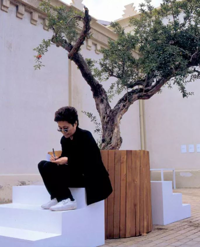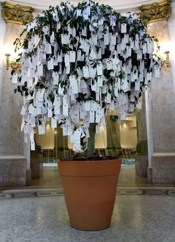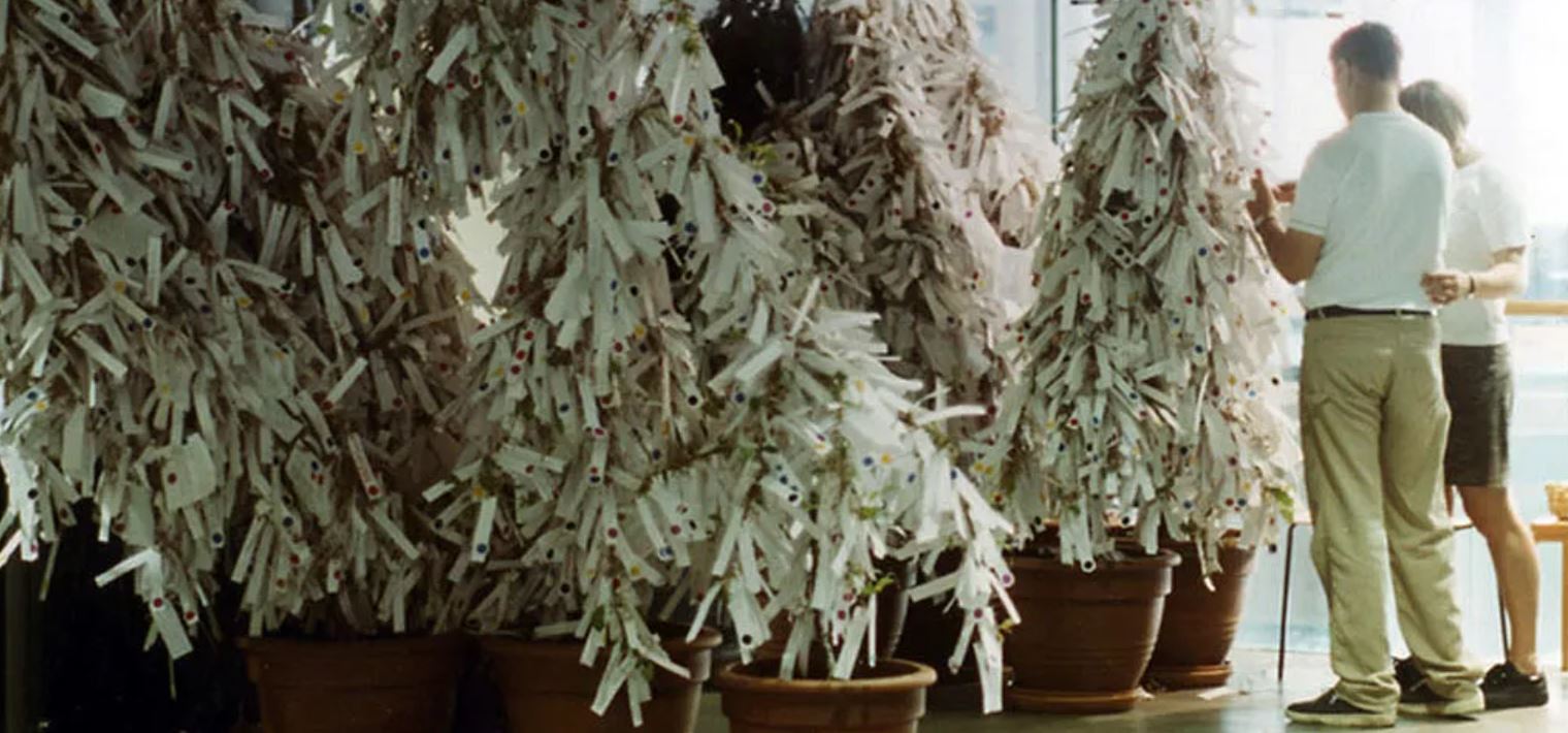 Ma da dove nasce l’idea dell’”albero dei desideri”? È la stessa artista a raccontarlo: “Da bambina, in Giappone, andavo al tempio, scrivevo un desiderio su un pezzo di carta leggera e lo legavo attorno al ramo di un albero. Gli alberi nei cortili dei templi erano sempre pieni di questi desideri annodati, che sembravano fiori bianchi che sbocciavano da lontano.” A partire dal 1996 (la prima installazione si tenne presso la Shoshana/Wayne Gallery a Santa Monica, California, in aprile) Wish Tree è poi divenuta un’opera interattiva, parte integrante di molte delle sue mostre in tutto il mondo, in cui i visitatori sono stati invitati a scrivere i loro personali auspici di pace e legarli a un ramo di un albero. Una delle esposizioni più memorabili si tenne in Finlandia, nel 1999, in cui il numero di piante era talmente elevato che venne ricreata una sorta di piccola foresta.