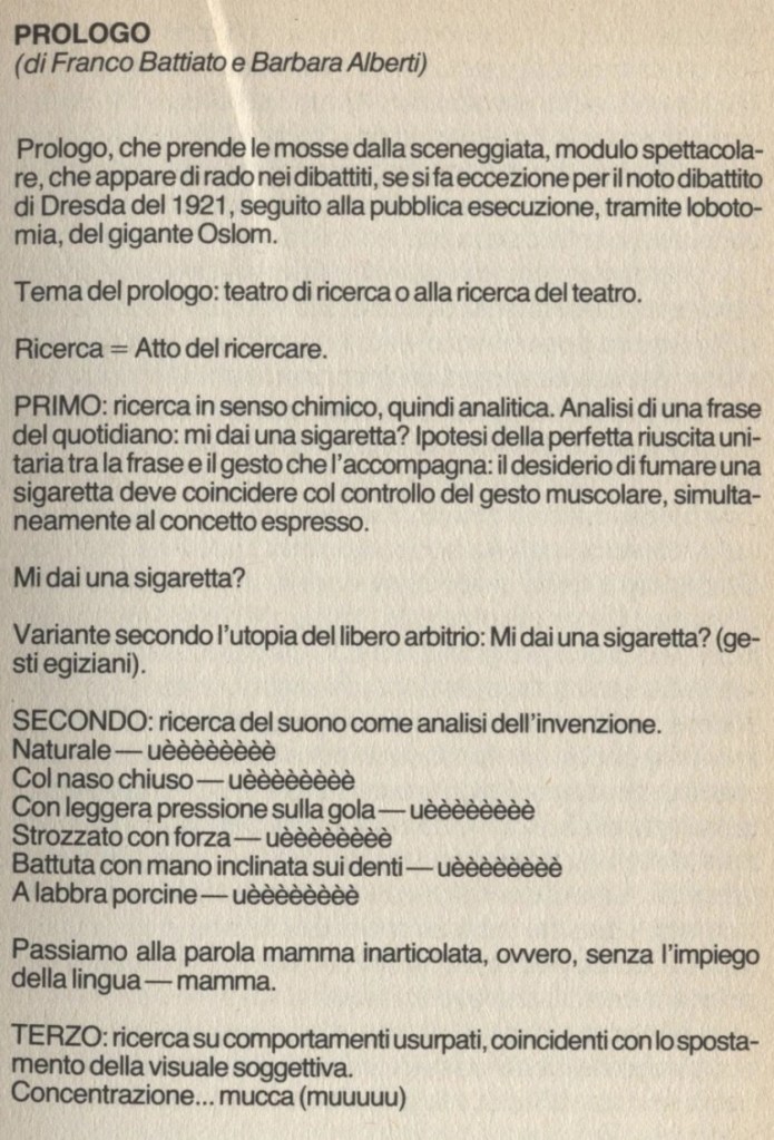 Fra tutte le più o meno recenti proposte di teatro totale, relativo, assoluto, liturgico, gastronomico, straniato, spontaneo, intellettuale, intellettualista, spontaneista, rigoroso, aperto, off, ufficiale, sotterraneo, la proposta di Battiato è quella che più liberamente esce dagli schemi della forma e dalle sbarre della stupidità.