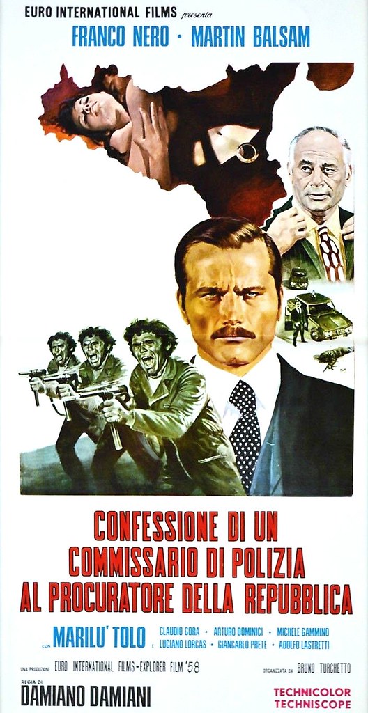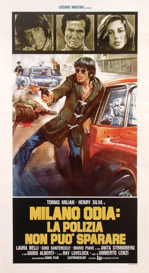 Tornando a quest’ultimo genere, tanto prolifico quanto disomogeneo per qualità ed intenti, la sua fortuna si può ravvisare nella commistione di elementi di noir, gangster movie, western, thriller, film d’inchiesta e fantapolitica, con qualche “spruzzata” di splatter qua e là. Una pellicola che può essere considerata un trait d’union tra il poliziesco ed il film politico è il celebrato Indagine su un cittadino al di sopra di ogni sospetto (1970) di Petri, in cui l’assassino è lo stesso ispettore di polizia, incarnato magistralmente da Gian Maria Volonté – che campeggia anche sulla copertina del volume di Fogliato – mentre la vicenda delittuosa è il pretesto per denunciare il Potere in senso lato. Nella maggior parte delle narrazioni, invece, la figura del commissario – spiega il critico – è tanto reale, nella sua lotta contro il crimine, che allegorica, poiché incarna, con la sua intransigenza, uno dei desideri inconfessabili del pubblico: la pena di morte per chi delinque. Esempio emblematico in questo senso è Napoli violenta (siamo sempre nel 1976), il secondo episodio della saga con Maurizio Merli nei panni del commissario Belli, preceduto e seguito da tanti altri titoli simili, ambientati nella giungla d’asfalto a varie latitudini dello stivale: Genova a mano armata, Roma violenta, Roma a mano armata, Milano violenta, Milano odia: la polizia non può sparare e via discorrendo. Terzo protagonista, oltre al poliziotto e all’antagonista, in tutti questi esempi, è l’automobile, lanciata in folli inseguimenti lungo i percorsi urbani: essa è “rappresentativa di un mondo interiore, connaturato al gesto prevaricatore, attraverso la deformazione del rapporto tra individuo e norma sociale”. Nello stesso anno, con i già citati lungometraggi di Corbucci/Milian nasce il sottogenere “comico”, che decreta in qualche modo la progressiva involuzione e la scomparsa, in capo a un lustro, del genere. E tanto Indagine su un cittadino… che il coevo Confessione di un commissario di polizia al procuratore della Repubblica, in cui Damiano Damiani racconta la collusione tra criminalità organizzata e la corruzione del sistema in modo esemplare – introducendo la tematica mafiosa, che verrà poi sviluppata in innumerevoli altri lavori – anticipano la “morte” del poliziesco all’italiana, mostrando funzionari corrotti. Il poliziotto è marcio di Fernando Di Leo (1975) è a questo proposito un titolo significativo di una fase in cui, nel verosimile filmico, la polizia non può fare altro che violare la legge, usando gli stessi sistemi della criminalità per ottenere giustizia, dichiarando in definitiva la propria sconfitta (uscendo di scena dal grande schermo nel giro di un lustro).