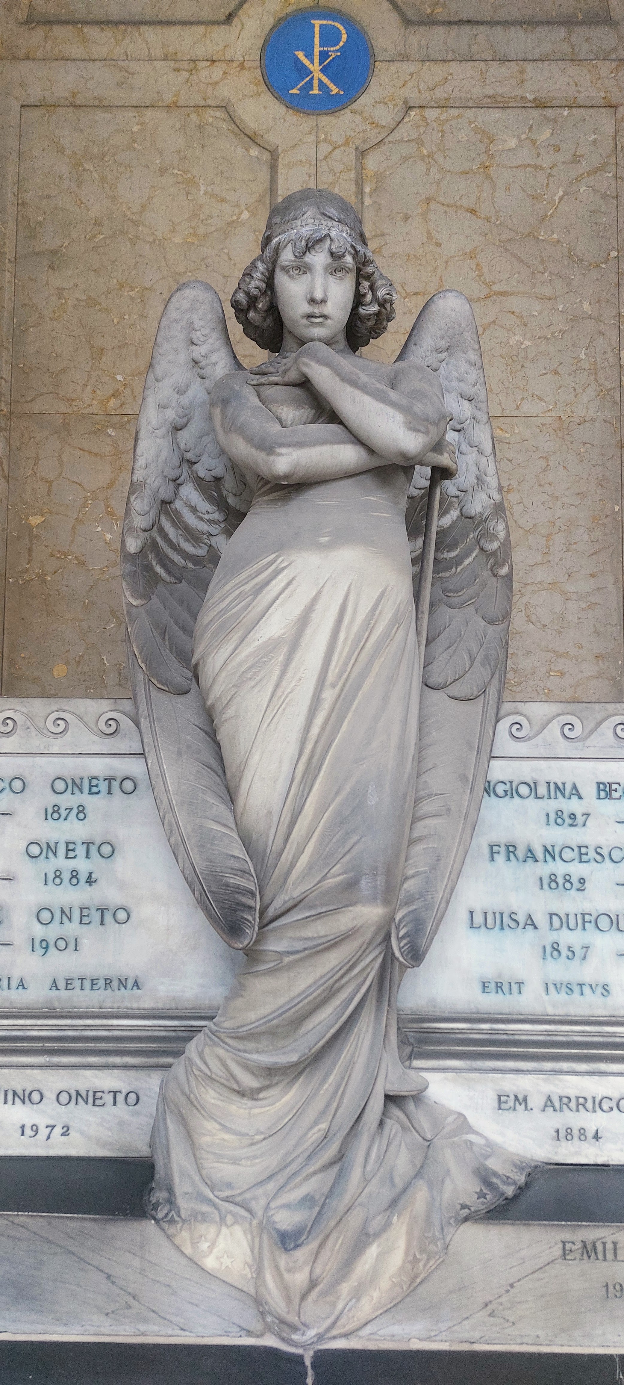 L’androgino angelo della Tomba Oneto rappresenta, sotto molti aspetti, il “punto di rottura” storico nel passaggio da una visione positivista della morte, che trovava nel realismo il linguaggio più congeniale, a quella permeata di dubbi che sfocerà nel clima decadente-simbolista. In questo processo di rinnovamento l’angelo perde la connotazione cristiana di guida verso il paradiso per divenire testimone del mistero del nulla: l’angelo Oneto non offre alcun gesto consolatorio, ma appare lontano e imperturbabile. Monteverde, inoltre, conferisce all’angelo sembianze femminili facendo così emergere il dualismo Eros – Thanatos che, da tempo, la scultura funeraria cercava di filtrare attraverso le sublimate raffigurazioni di virtù e di dolenti.