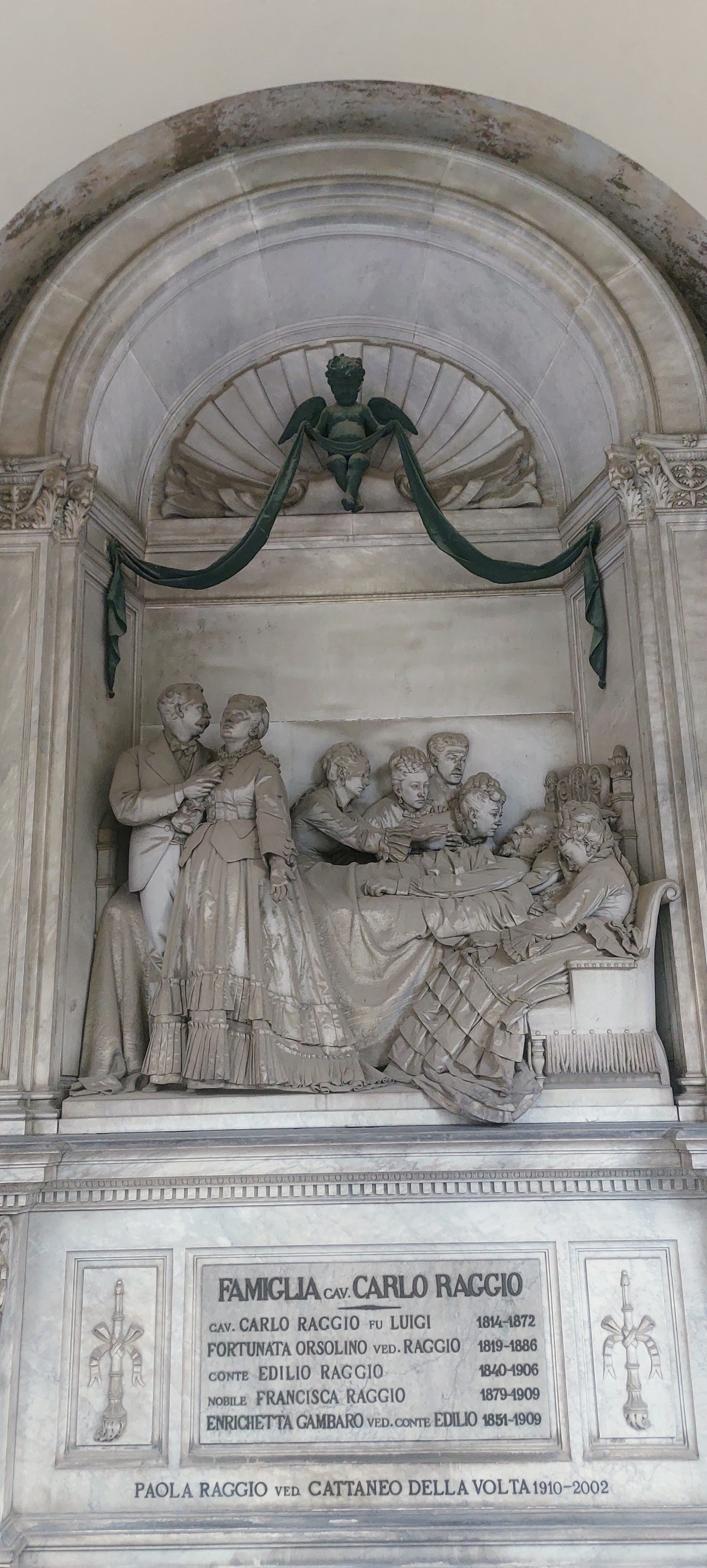 La tomba della famiglia Raggio (n. 10, sett. D), opera di Augusto Rivalta (1872), è una rappresentazione del compianto dei familiari riuniti al capezzale del defunto Carlo. È un tipico esempio di “realismo borghese”: prevale infatti il verismo dei particolari (come gli accurati dettagli degli abiti e delle capigliature) senza alcun elemento consolatorio.