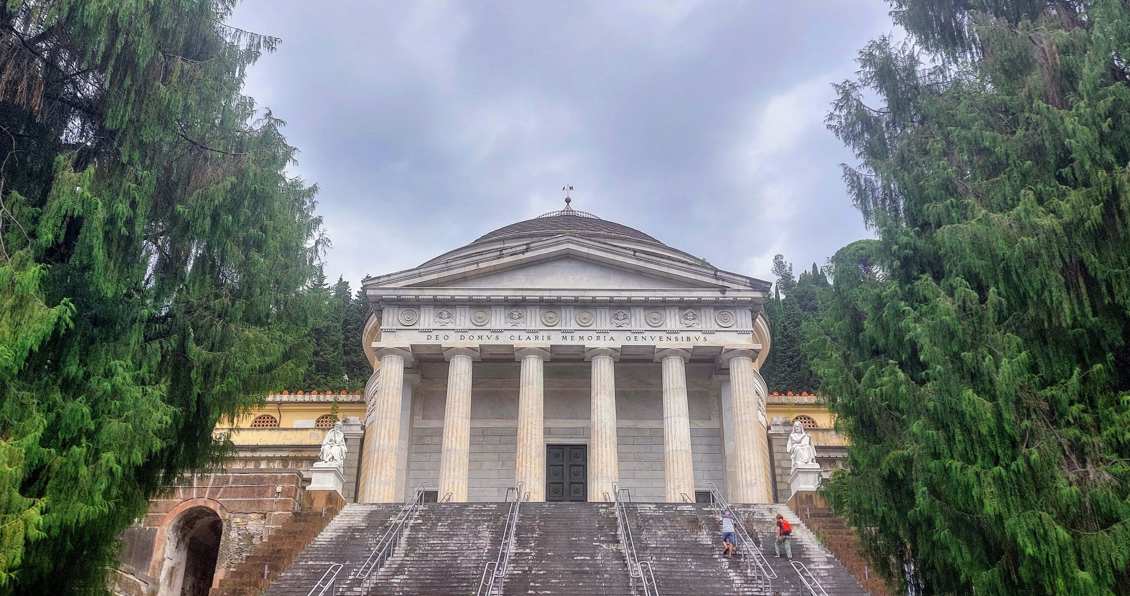 Molte delle sculture più pregevoli si trovano nei porticati ai lati del Pantheon. Di grande valenza scenografica, l’edificio si innalza alla sommità di una scalinata, in linea con l’ingresso principale, e segue modelli romani, ma si rifà anche al Tempio di Canova a Possagno. Venne aperto al culto nel 1878.