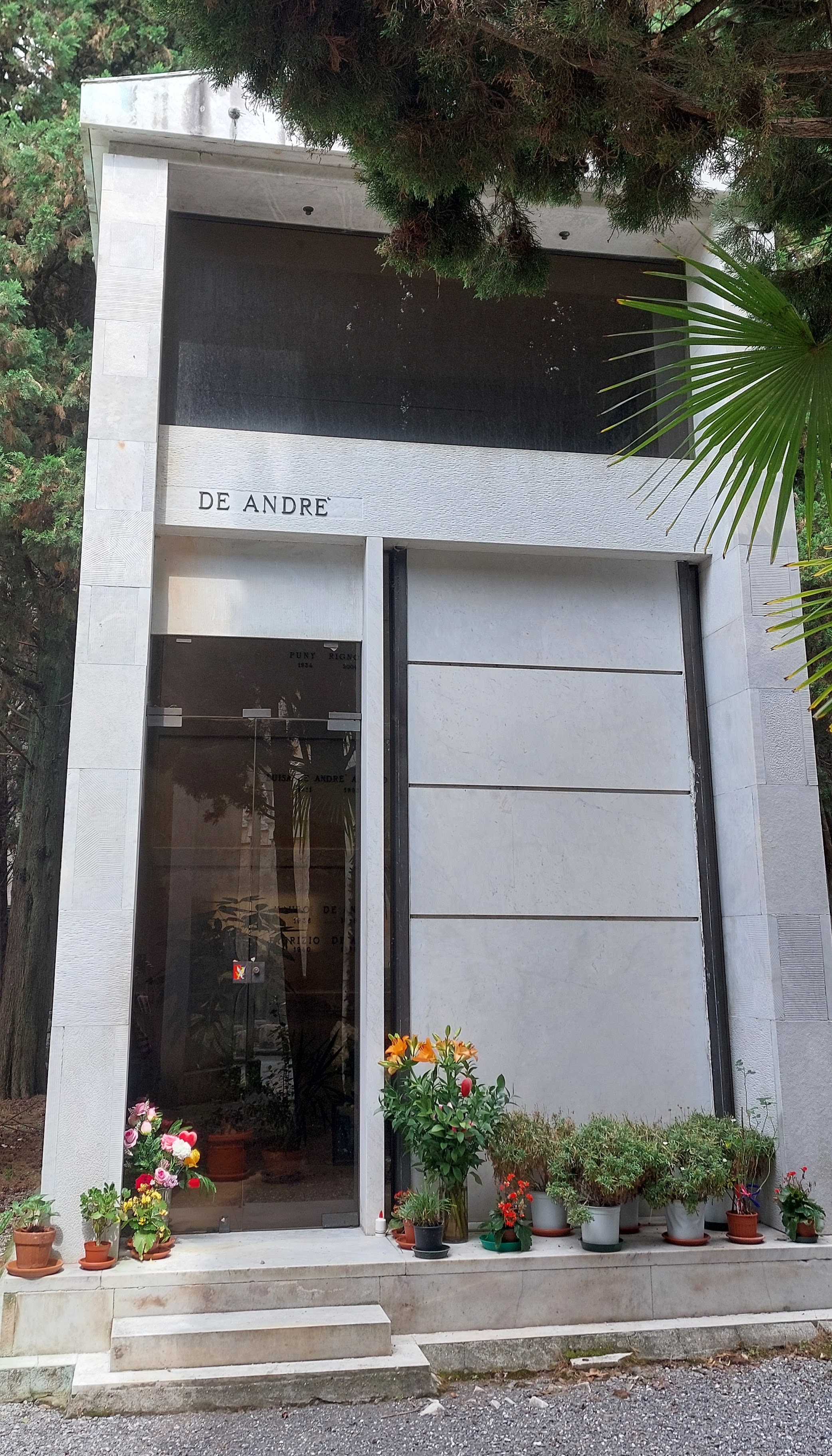 Di grande impatto anche la tomba Caprile (n. 3 -sett. B), in cui il marmo bianco delle tre figure femminili (che alludono alle Tre Grazie di Canova) contrasta con il nero della nicchia. Realizzata nel 1924 da Edoardo De Albertis, la raffigurazione è un esempio dell’iconografia della “Bella Morte”, vale a dire una rappresentazione novecentesca del tema funebre dagli stilemi neoclassici, intrisa di malinconia e di dolcezza.