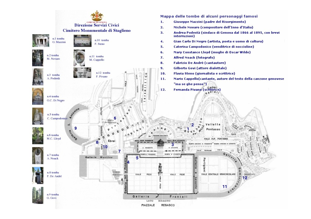 Quanto ai personaggi famosi che riposano a Staglieno, eccone alcuni: lo stesso progettista Carlo Barabino riposa nel Pantheon, così come il patriota risorgimentale Nino Bixio; le spoglie dell’attore dialettale Gilberto Govi si trovano nel porticato S. Antonino; lo scenografo Emanuele Luzzati e il regista Aldo Trionfo sono nel cimitero ebraico; Ferruccio Parri è nel boschetto irregolare, non lontano dal mausoleo di Giuseppe Mazzini; Fernanda Pivano nel Cinerario; il sindacalista della CGIL Guido Rossa, ucciso nel 1979 dalle Brigate Rosse, è invece sepolto nella Galleria frontale. Meta di pellegrinaggi è poi la tomba di Fabrizio De André, nella cappella di famiglia nel campo 22 insieme ai genitori, al fratello Mauro e alla prima moglie Puny.